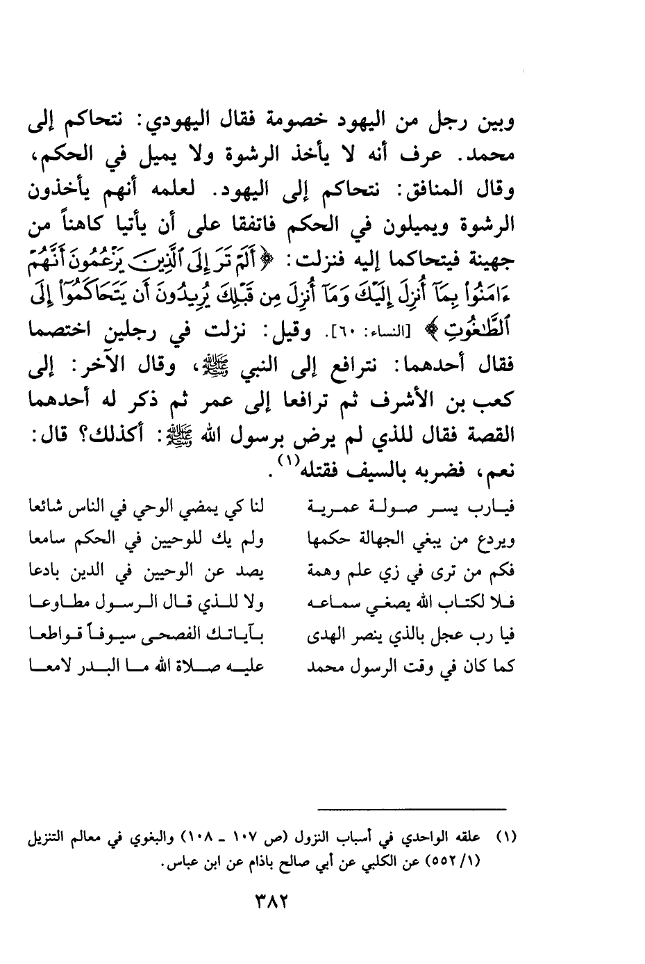 وبين رجل من اليهود خصومة فقال اليهودي: نتحاكم إلى محمد. عرف أنه لا يأخذ الرشوة ولا يميل في الحكم، وقال المنافق: نتحاكم إلى اليهود. لعلمه أنهم يأخذون الرشوة ويميلون في الحكم فاتفقا على أن يأتيا كاهناً من جهينة فيتحاكما إليه فنزلت: {أَلَمْ تَرَ إِلَى الَّذِينَ يَزْعُمُونَ أَنَّهُمْ آمَنُوا بِمَا أُنْزِلَ إِلَيْكَ وَمَا أُنْزِلَ مِنْ قَبْلِكَ يُرِيدُونَ أَنْ يَتَحَاكَمُوا إِلَى الطَّاغُوتِ} [النساء: 60] . وقيل: نزلت في رجلين اختصما فقال أحدهما: نترافع إلى النبي صلى الله عليه وسلم، وقال الآخر: إلى كعب بن الأشرف ثم ترافعا إلى عمر ثم ذكر له أحدهما القصة فقال للذي لم يرض برسول الله صلى الله عليه وسلم: أكذلك؟ قال: نعم، فضربه بالسيف فقتله1.