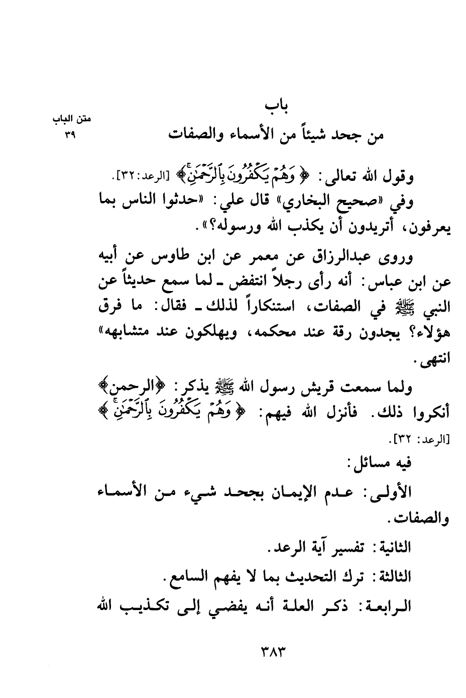 الأولى: عدم الإيمان بجحد شيء من الأسماء والصفات.