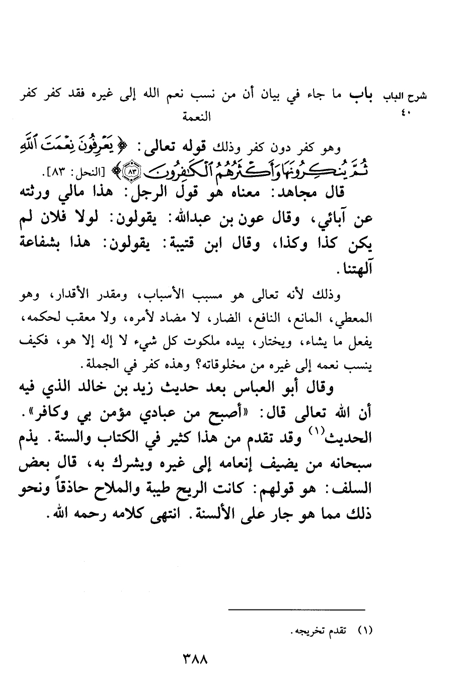 باب ما جاء في بيان أن من نسب نعم الله إلى غيره فقد كفر كفر النعمة
