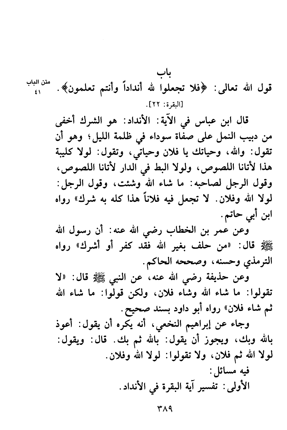 قال ابن عباس في الآية: الأنداد: "هو الشرك أخفى من دبيب النمل على صفاة سوداء في ظلمة الليل؛ وهو أن تقول: والله، وحياتك يا فلان وحياتي، وتقول: لولا كليبة هذا لأتانا اللصوص، ولولا البط في الدار لأتانا اللصوص، وقول الرجل لصاحبه: ما شاء الله وشئت، وقول الرجل: لولا الله وفلان. لا تجعل فيها فلاناً هذا كله به شرك" رواه ابن أبي حاتم.