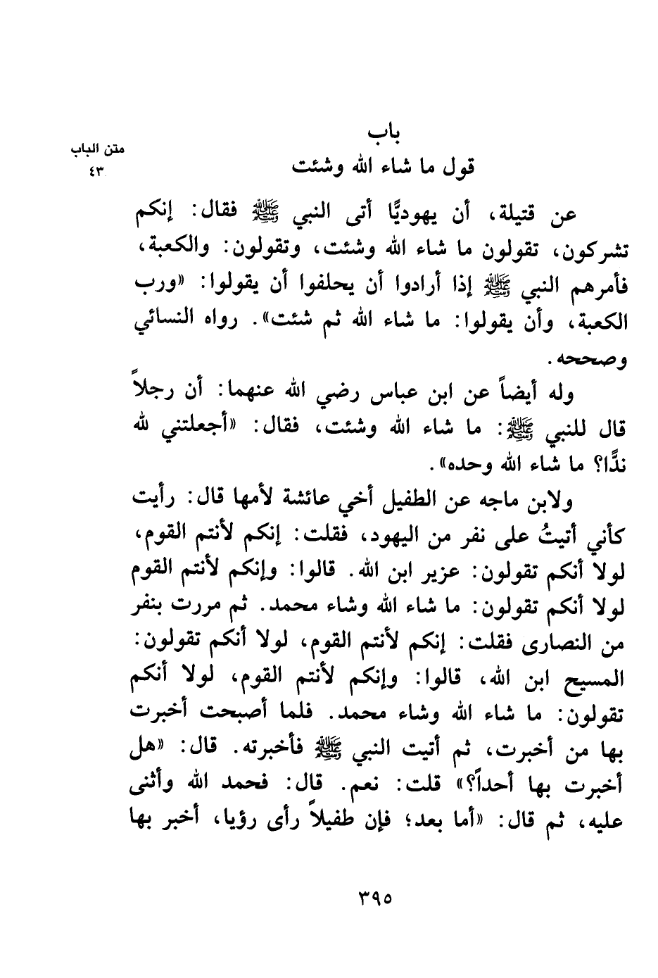ولابن ماجه عن الطفيل أخي عائشة لأمها قال: رأيت كأني أتيتُ على نفر من اليهود، فقلت: إنكم لأنتم القوم، لولا أنكم تقولون: عزير ابن الله. قالوا: وإنكم لأنتم القوم لولا أنكم تقولون: ما شاء الله وشاء محمد. ثم مررت بنفر من النصارى فقلت: إنكم لأنتم القوم، لولا أنكم تقولون: المسيح ابن الله، قالوا: وإنكم لأنتم القوم، لولا أنكم تقولون: ما شاء الله وشاء محمد. فلما أصبحت أخبرت بها من أخبرت، ثم أتيت النبي صلى الله عليه وسلم فأخبرته. قال: "هل أخبرت بها أحداً؟ " قلت: نعم. قال: فحمد الله وأثنى عليه، ثم قال: "أما بعد؛ فإن طفيلاً رأى رؤيا، أخبر بها