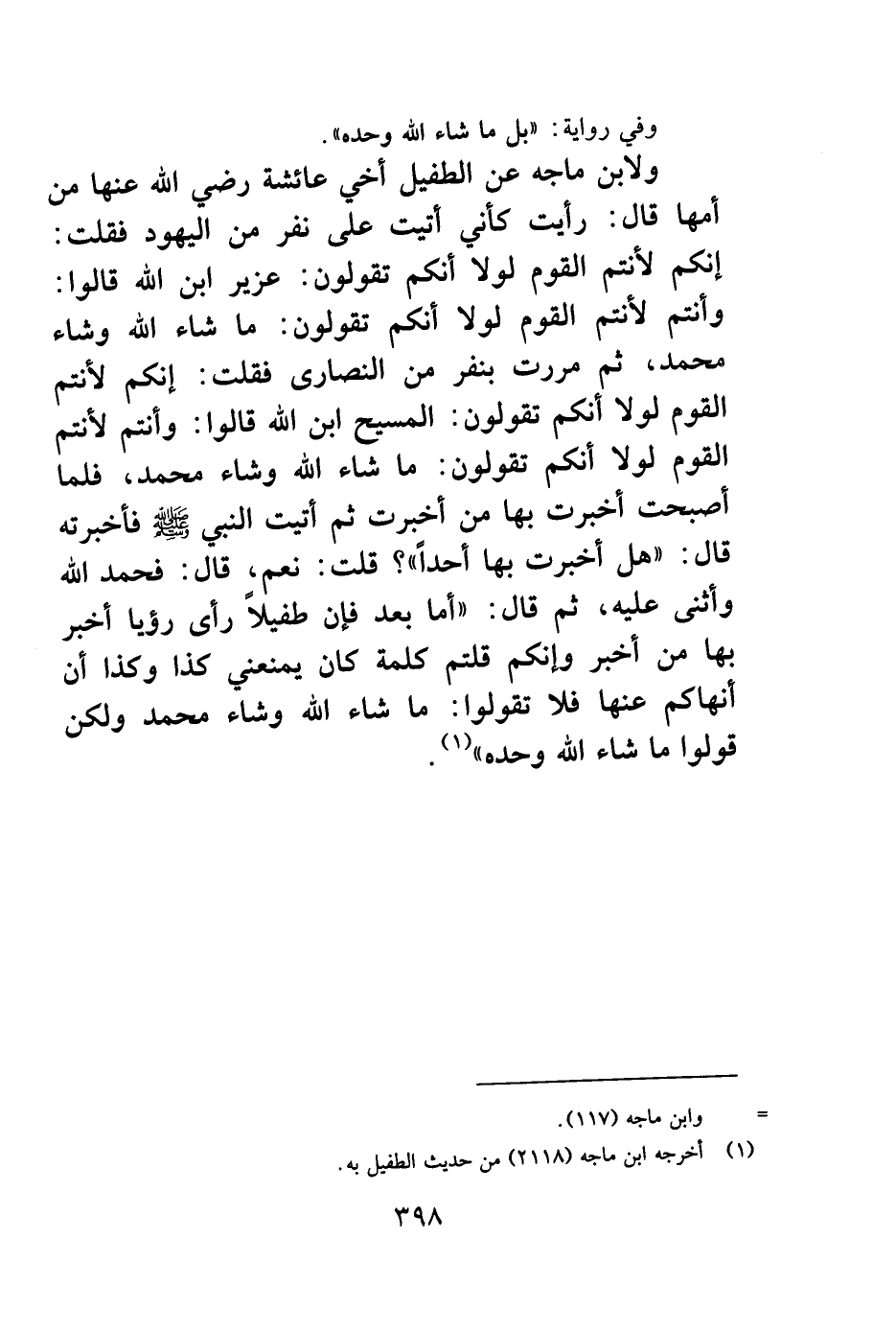 ولابن ماجه عن الطفيل أخي عائشة رضي الله عنها من أمها قال: رأيت كأني أتيت على نفر من اليهود فقلت: إنكم لأنتم القوم لولا أنكم تقولون: عزير ابن الله قالوا: وأنتم لأنتم القوم لولا أنكم تقولون: ما شاء الله وشاء محمد، ثم مررت بنفر من النصارى فقلت: إنكم لأنتم القوم لولا أنكم تقولون: المسيح ابن الله قالوا: وأنتم لأنتم القوم لولا أنكم تقولون: ما شاء الله وشاء محمد، فلما أصبحت أخبرت بها من أخبرت ثم أتيت النبي صلى الله عليه وسلم فأخبرته قال: "هل أخبرت بها أحداً؟ " قلت: نعم، قال: فحمد الله وأثنى عليه، ثم قال: "أما بعد فإن طفيلاً رأى رؤيا أخبر بها من أخبر وإنكم قلتم كلمة كان يمنعني كذا وكذا أن أنهاكم عنها فلا تقولوا: ما شاء الله وشاء محمد ولكن قولوا: ما شاء الله وحده" 1.