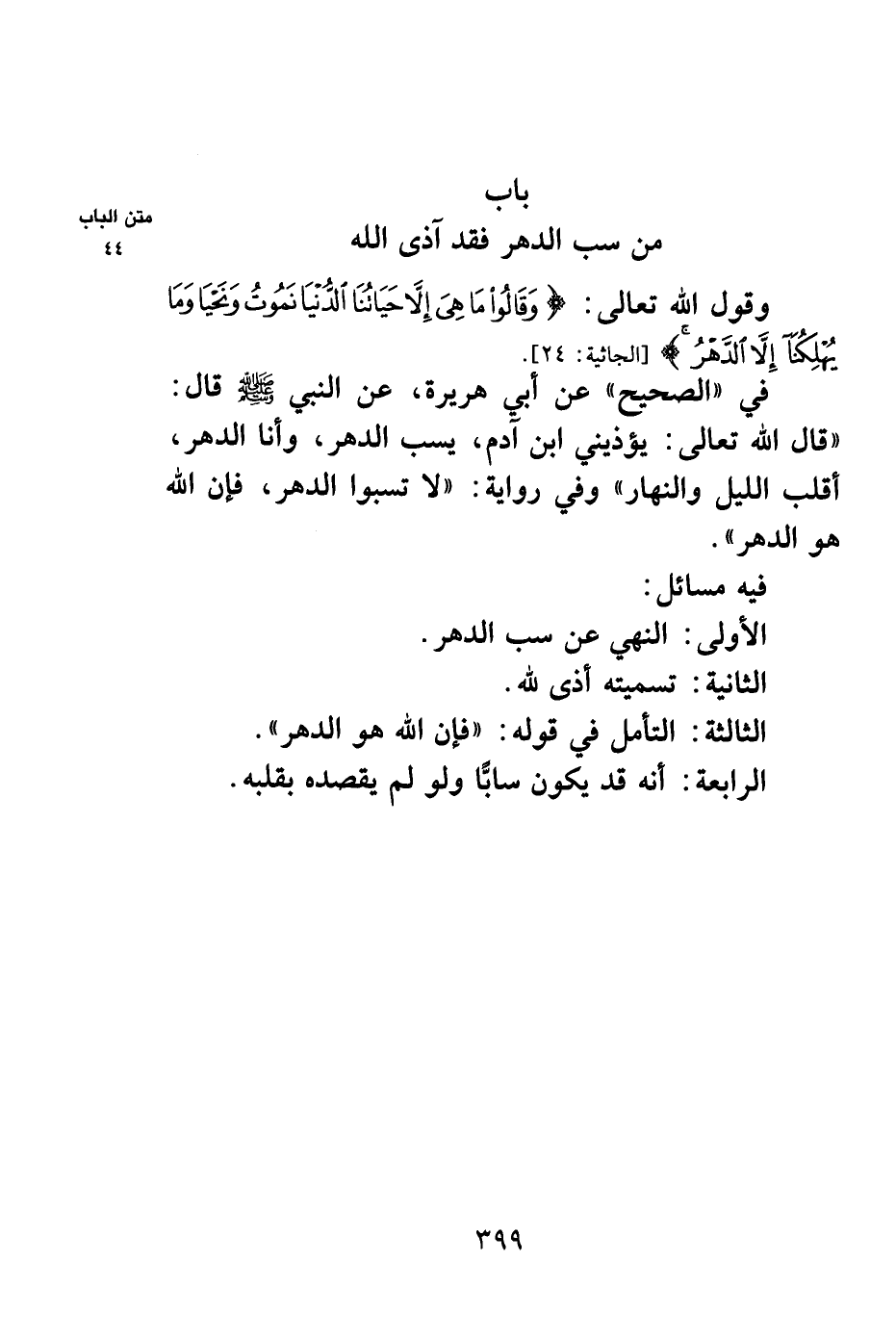 في "الصحيح" عن أبي هريرة، عن النبي صلى الله عليه وسلم قال: "قال الله تعالى: يؤذيني ابن آدم، يسب الدهر، وأنا الدهر، أقلب الليل والنهار" وفي رواية: "لا تسبوا الدهر، فإن الله هو الدهر".