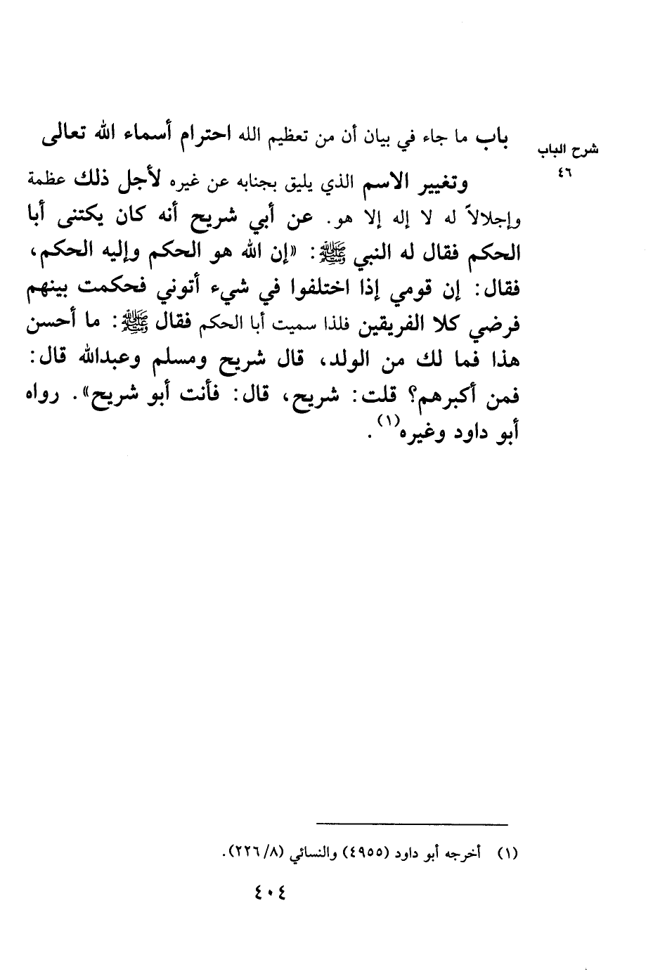 باب ما جاء في بيان أن من تعظيم الله احترام أسماء الله تعالى وتغيير الاسم الذي يليق بجنابه عن غيره لأجل ذلك عظمة وإجلالاً له لا إله إلا هو. عن أبي شريح أنه كان يكتنى أبا الحكم فقال له النبي صلى الله عليه وسلم: "إن الله هو الحكم وإليه الحكم" فقال: إن قومي إذا اختلفوا في شيء أتوني فحكمت بينهم فرضي كلا الفريقين فلذا سميت أب الحكم فقال: ما أحسن هذا فمالك من الولد، قال: شريح ومسلم وعبد الله قال: فمن أكبرهم؟ قلت: شريح، قال: فأنت أبو شريح"، رواه أبو داود وغيره1.