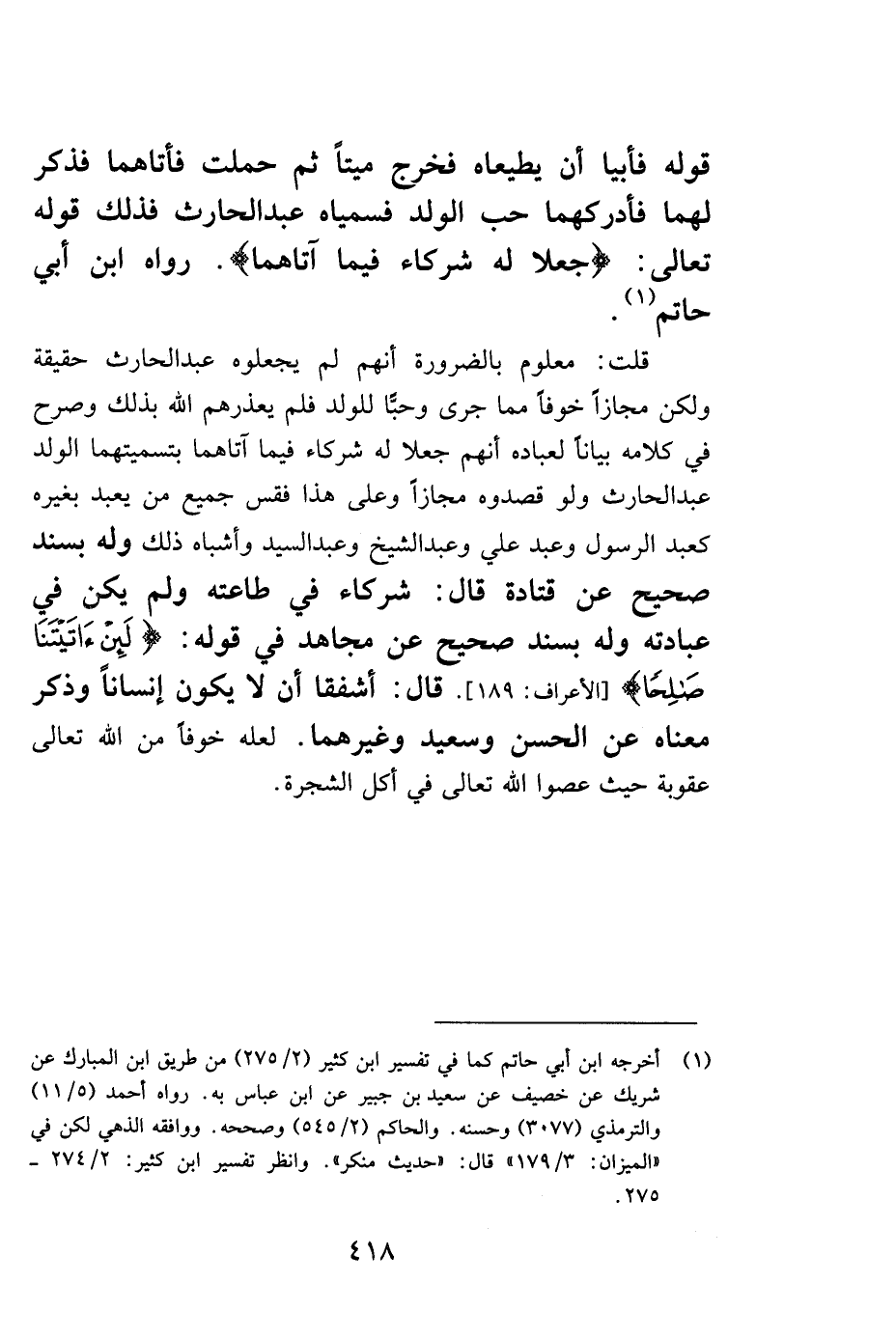 قلت: معلوم بالضرورة أنهم لم يجعلوه عبد الحارث حقيقة ولكن مجازاً خوفاً مما جرى وحبًّل للولد فلم يعذرهم الله بذلك وصرح في كلامه بياناً لعباده أنهم جعلا له شركاء فيما آتاهما بتسميتهما الولد عبد الحارث ولو قصدوه مجازاً وعلى هذا فقس جميع من يعبد بغيره كعبد الرسول وعبد علي وعبد الشيخ وعبد السيد وأشباه ذلك وله بسند صحيح عن قتادة قال: شركاء في طاعته ولم يكن في عبادته وله بسند صحيح عن مجاهد في قوله: {لَئِنْ آتَيْتَنَا صَالِحاً} [الأعراف: 189] . قال: أشفقا ألا يكون إنساناً وذكر معناه عن الحسن وسعيد وغيرهما. لعله خوفاً من الله تعالى عقوبة حيث عصوا الله تعالى في أكل الشجرة.