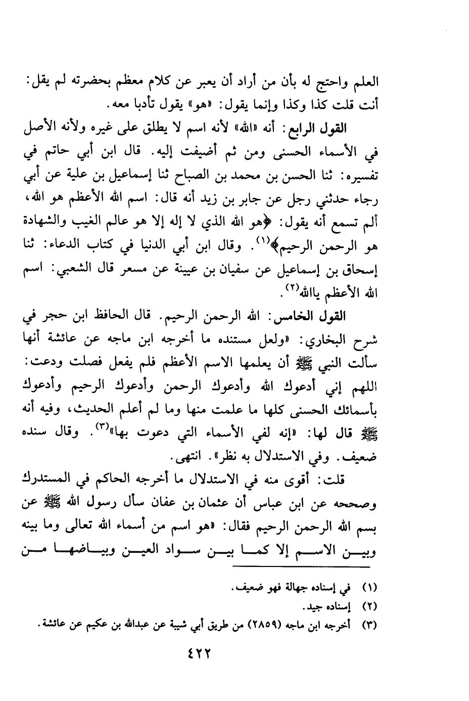 القول الخامس: الله الرحمن الرحيم. قال الحافظ ابن حجر في شرح البخاري: "ولعل مستنده ما أخرجه ابن ماجه عن عائشة أنها سألت النبي صلى الله عليه وسلم أن يعلمها الاسم الأعظم فلم يفعل فصلت ودعت: اللهم إني أدعوك الله وادعوك الرحمن وادعوك الرحيم وادعوك بأسمائك الحسنى كلها ما علمت منها وما لم أعلم الحديث، وفيه أنه صلى الله عليه وسلم قال لها: "إنه لفي الأسماء التي دعوت بها" 3. وقال سنده ضعيف. وفي الاستدلال به نظر". انتهى.