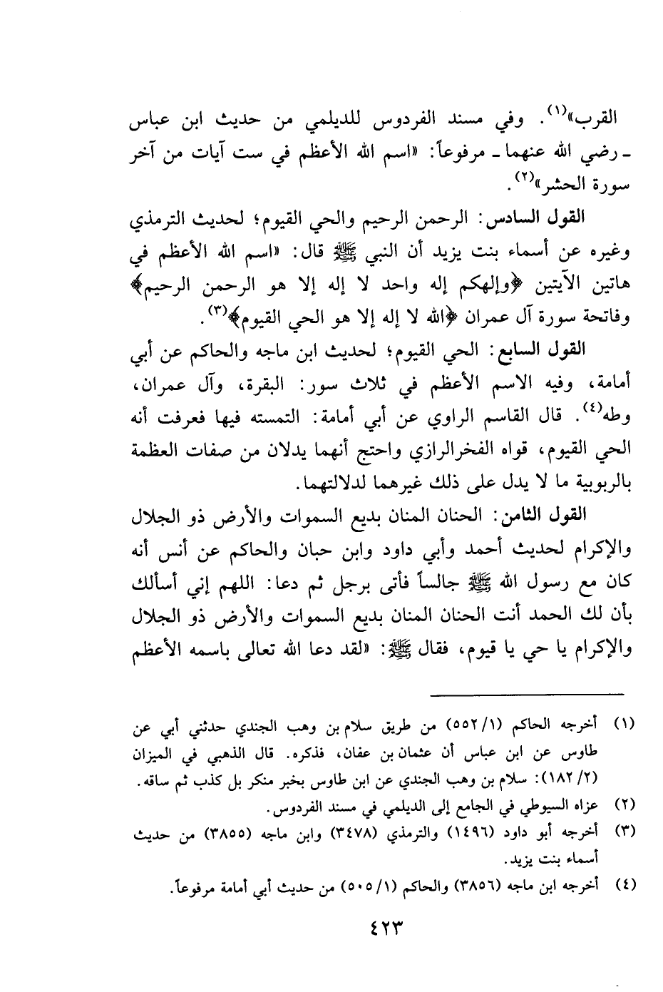 القرب"1. وفي مسند الفردوس للديلمي من حديث ابن عباس -رضي الله عنهما- مرفوعاً: "اسم الله الأعظم في ست آيات من آخر سورة الحشر" 2.