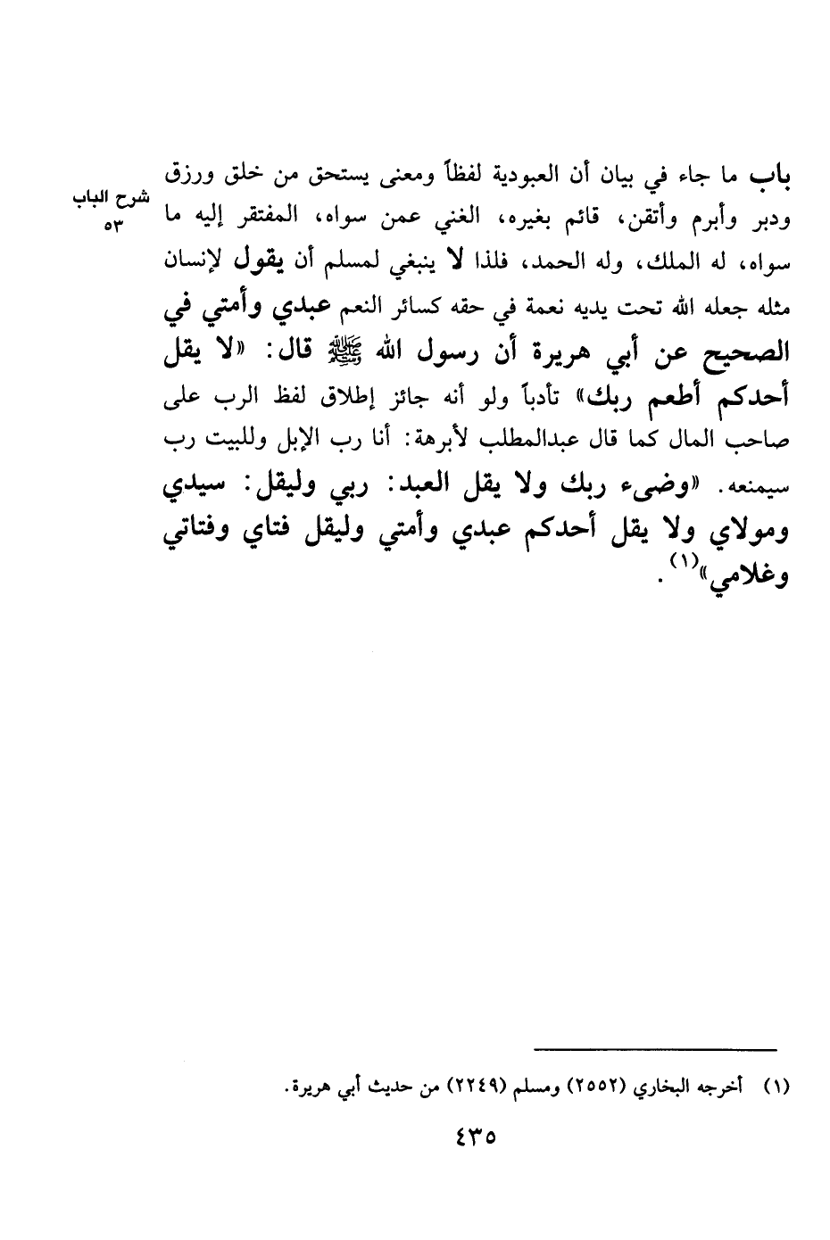باب ما جاء في بيان أن العبودية لفظاً ومعنى يستحق من خلق ورزق ودبر وأبرم وأتقن، قائم بغيره، الغني عمن سواه، المفتقر إليه ما سواه، له الملك، وله الحمد، فلذا لا ينبغي لمسلم أن يقول لإنسان مثله جعله الله تحت يديه نعمة في حقه كسائر النعم عبدي وأمتي في الصحيح عن أبي هريرة أن رسول الله صلى الله عليه وسلم قال: "لا يقل أحدكم أطعم ربك" تأدباً ولو أنه جائز إطلاق لفظ الرب على صاحب المال كما قال عبد المطلب لأبرهة: أنا رب الإبل وللبيت رب سيمنعه. "وضىء ربك ولا يقل العبد: ربي وليقل: سيدي ومولاي ولا يقل أحدكم عبدي وأمتي وليقل فتاي وفتاتي وغلامي" 1.
