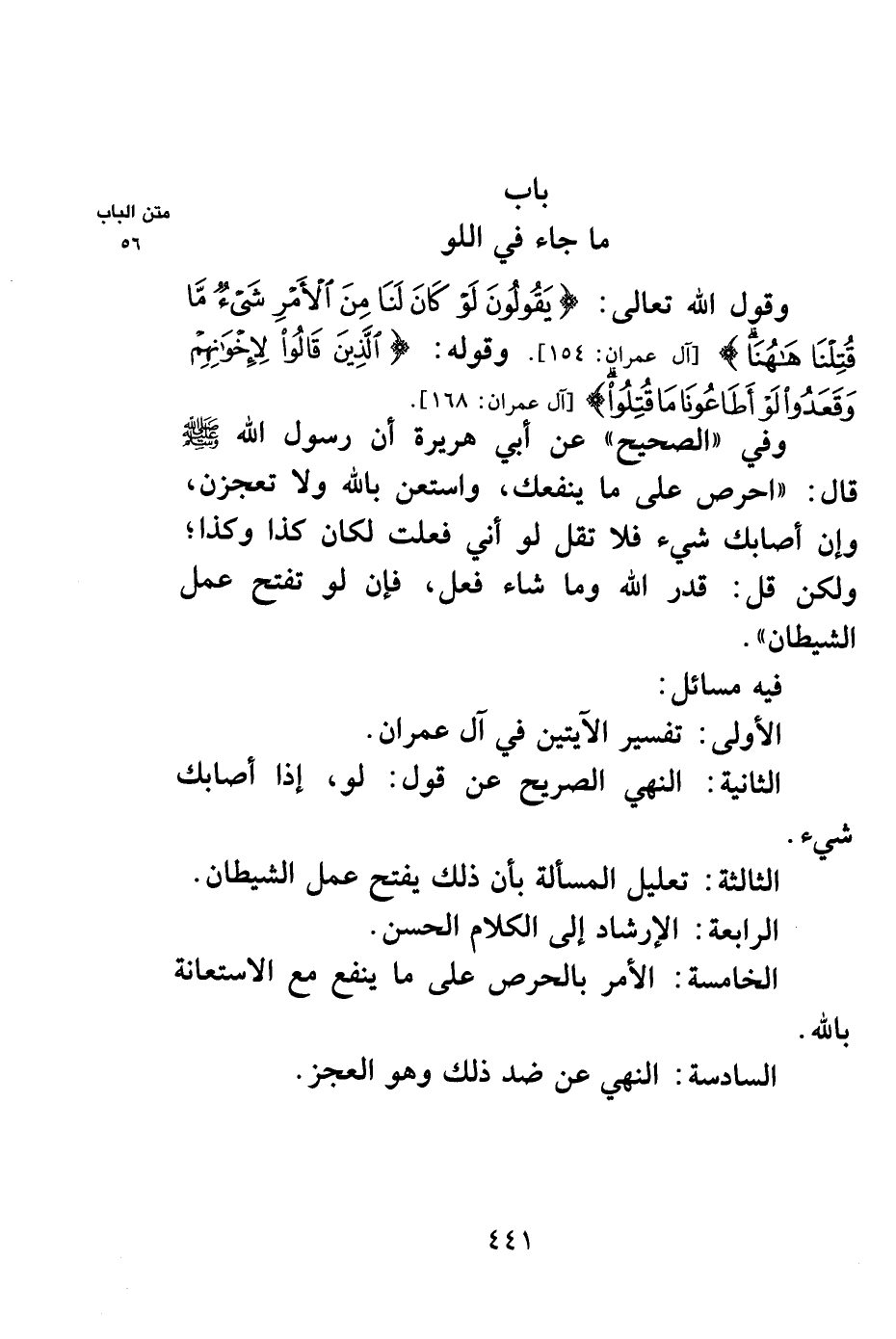في "الصحيح" عن أبي هريرة أن رسول الله صلى الله عليه وسلم قال: "احرص على ما ينفعك، واستعن بالله ولا تعجزن، وإن أصابك شيء فلا تقل لو أني فعلت لكان كذا وكذا؛ ولكن قل: قدر الله وما شاء فعل، فإن لو تفتح عمل الشيطان".