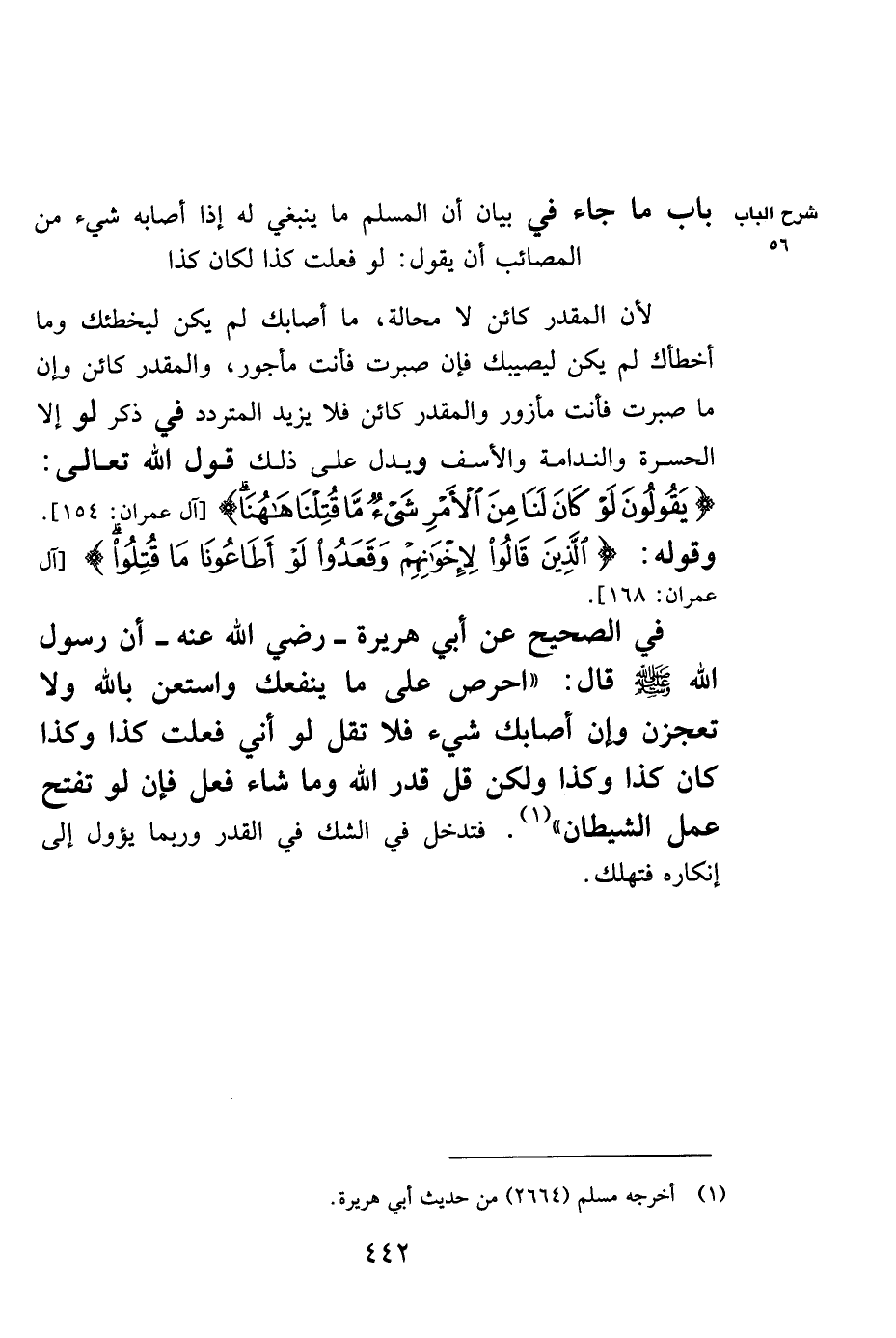 في "الصحيح" عن أبي هريرة -رضي الله عنه- أن رسول الله صلى الله عليه وسلم قال: "احرص على ما ينفعك واستعن بالله ولا تعجزن وإن أصابك شيء فلا تقل لو أني فعلت كذا وكذا لكان كذا وكذا ولكن قل قدر الله وما شاء فعل فإن لو تفتح عمل الشيطان"1. فتدخل في الشك في القدر وربما يؤول لى إنكاره فتهلك.