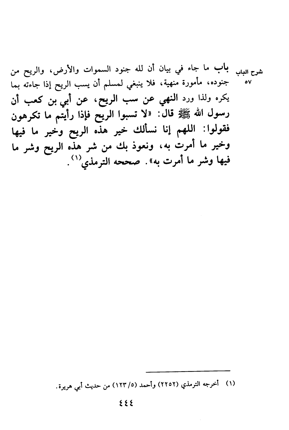 باب ما جاء في بيان أن لله جنود السموات والأرض، والريح من جنوده، مأمورة منهية، فلا ينبغي لمسلم أن يسب الريح إذا جاءته بما يكره ولذا ورد النهي عن سب الريح، عن أبي بن كعب رضي الله عنه أن رسول الله صلى الله عليه وسلم قال: "لا تسبوا الريح، فإذا رأيتم ما تكرهون فقولوا: اللهم إنا نسألك خير هذه الريح وخير ما فيها، وخير ما أمرت به ونعوذ بك من شر هذه الريح وشر ما فيها وشر ما أمرت به". صححه الترمذي1.