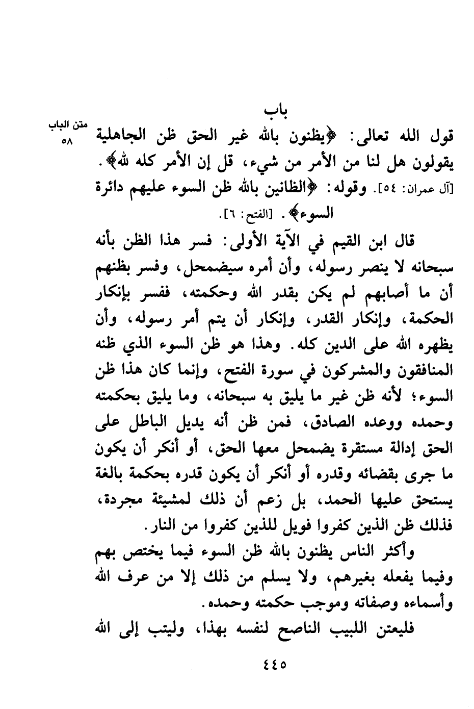 باب: قول الله تعالى: {يَظُنُّونَ بِاللَّهِ غَيْرَ الْحَقِّ ظَنَّ الْجَاهِلِيَّةِ يَقُولُونَ هَلْ لَنَا مِنَ الْأَمْرِ مِنْ شَيْءٍ قُلْ إِنَّ الْأَمْرَ كُلَّهُ لِلَّهِ} . [آل عمران: 154] . وقوله: {الظَّانِّينَ بِاللَّهِ ظَنَّ السَّوْءِ عَلَيْهِمْ دَائِرَةُ السَّوْءِ} . [الفتح: 6] .