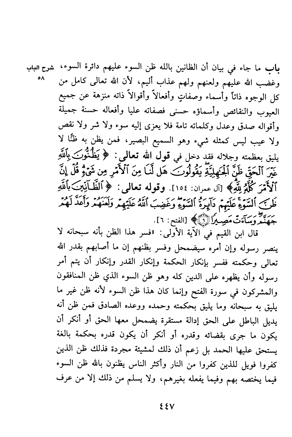 باب ما جاء في بيان أن الظانين بالله ظن السوء عليهم دائر السوء، وغضب الله عليهم ولعنهم ولهم عذاب أليم، لأن الله تعالى كامل من كل الوجوه ذاتاً وأسماء وصفاتٍ وأفعالاً وأقوالاً ذاته منزهة عن جميع العيوب والنقائص وأسماؤه حسنى فصفاته عليا وأفعاله حسنة جميلة وأقواله صدق وعدل وكلماته تامة فلا يعزى إليه سوء ولا شر ولا نقص ولا عيب ليس كمثله شيء وهو السميع البصير، فمن يظن به ظنًّا لا يليق بعظمته وجلاله فقد دخل في قال تعالى: {يَظُنُّونَ بِاللَّهِ غَيْرَ الْحَقِّ ظَنَّ الْجَاهِلِيَّةِ يَقُولُونَ هَلْ لَنَا مِنَ الْأَمْرِ مِنْ شَيْءٍ قُلْ إِنَّ الْأَمْرَ كُلَّهُ لِلَّهِ} . [آل عمران: 154] . وقوله تعالى: {الظَّانِّينَ بِاللَّهِ ظَنَّ السَّوْءِ عَلَيْهِمْ دَائِرَةُ السَّوْءِ وَغَضِبَ اللَّهُ عَلَيْهِمْ وَلَعَنَهُمْ وَأَعَدَّ لَهُمْ جَهَنَّمَ وَسَاءَتْ مَصِيراً} . [الفتح: 6] .