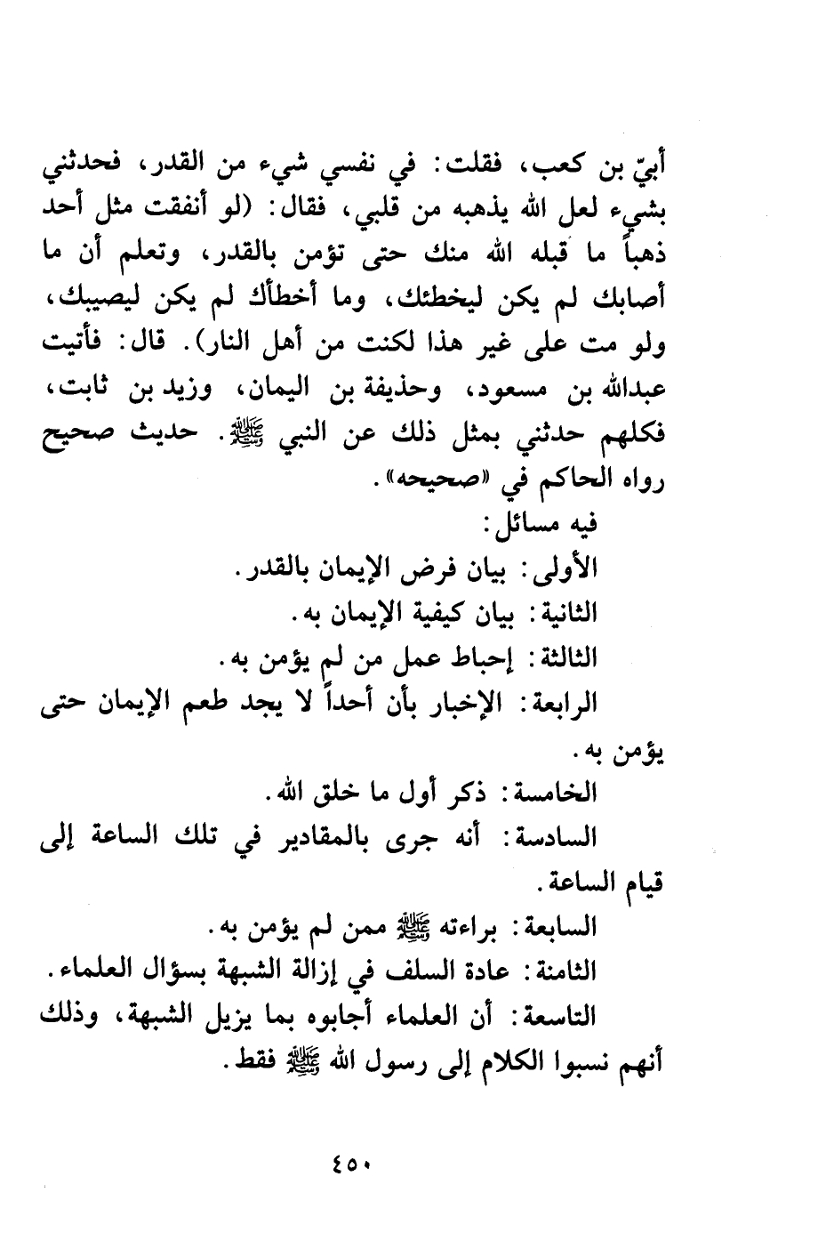 أبي بن كعب، فقلت: في نفسي شيء من القدر، فحدثني بشيء لعل الله يذهبه من قلبي، فقال: "لو أنفقت مثل أحد ذهباً ما قبله الله منك حتى تؤمن بالقدر، وتعلم أن ما أصابك لم يكن ليخطئك، وما أخطأك لم يكن ليصيبك، ولو مت على غير هذا لكنت من أهل النار". قال: فأتيت عبد الله بن مسعود، وحذيفة بن اليمان، وزيد بن ثابت، فكلهم حدثني بمثل ذلك عن النبي صلى الله عليه وسلم. حديث صحيح رواه الحاكم في "صحيحه".