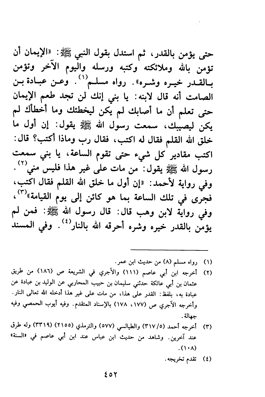 حتى يؤمن بالقدر، ثم استدل بقول النبي صلى الله عليه وسلم: "الإيمان أن تؤمن بالله وملائكته وكتبه ورسله واليوم الآخر وتؤمن بالقدر خيره وشره". رواه مسلم1. وعن عبادة بن الصامت أنه قال لابنه: يا بني إنك لن تجد طعم الإيمان حتى تعلم أن ما أصابك لم يكن ليخطئك وما أخطأك لم يكن ليصيبك سمعت رسول الله صلى الله عليه وسلم يقول: إن أول ما خلق الله القلم فقال له: اكتب، فقال: رب وماذا أكتب؟ قال: أكتب مقادير كل شيء حتى تقوم الساعة يا بني سمعت رسول الله صلى الله وسلم يقول: من مات على غير هذا فليس مني2. وفي رواية لأحمد: "إن أول ما خلق الله تعالى القلم فقال اكتب، فجرى في تلك الساعة بما هو كائن إلى يوم القيامة" 3، وفي رواية لابن وهب قال: قال رسول الله صلى الله عليه وسلم: "فمن لم يؤمن بالقدر خيره وشره أحرقه الله بالنار" 4. وفي المسند