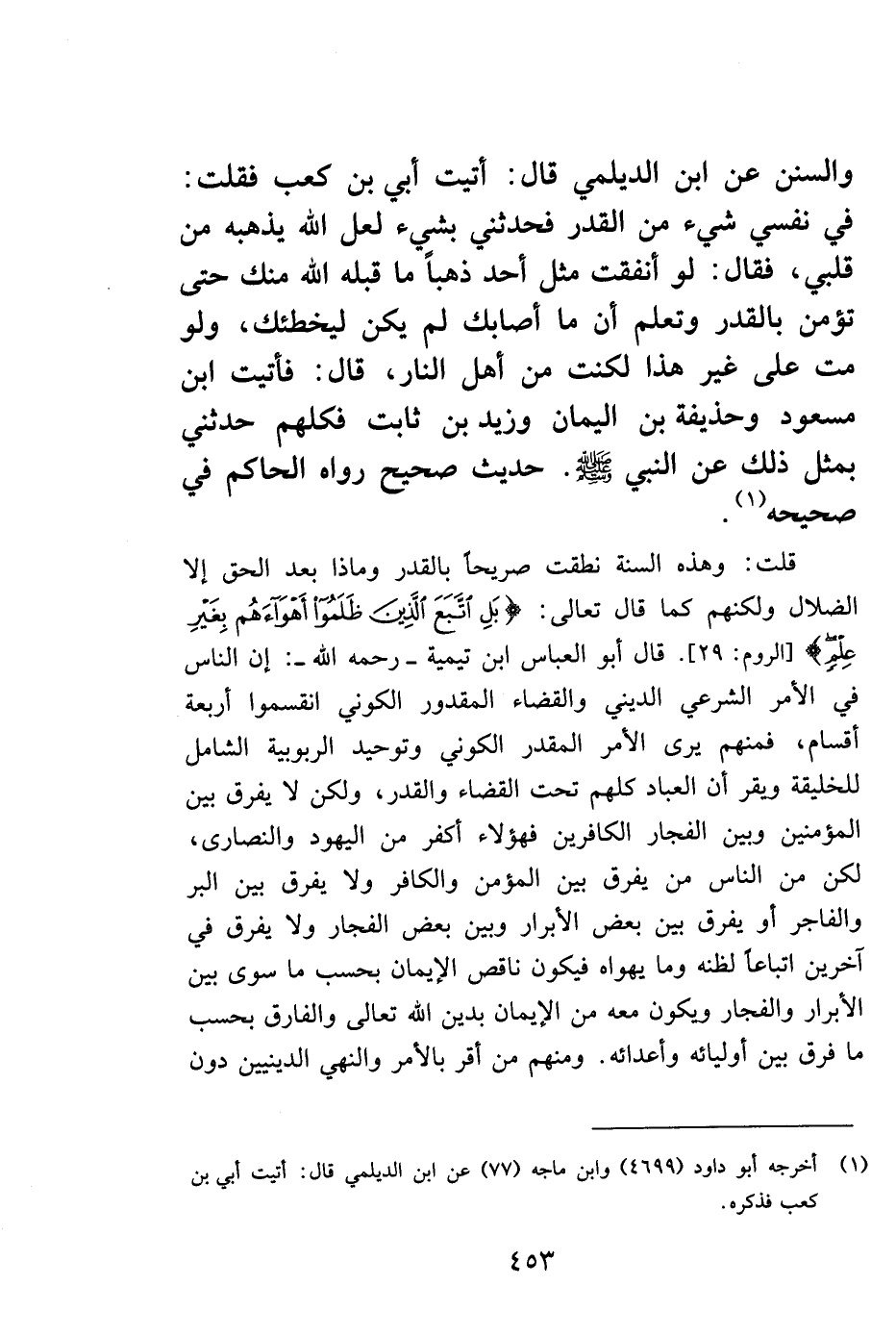 والسنن عن ابن الديلمي قال: أتيت أبي بن كعب فقلت: في نفسي شيء من القدر فحدثني بشيء لعل الله يذهبه من قلبي، فقال: لو أنفقت مثل أحد ذهباً ما قبله الله منك حتى تؤمن بالقدر وتعلم أن ما أصابك لم يكن ليخطئك، ولو مت على غير هذا لكنت من أهل النار، قال: فأتيت ابن مسعود وحذيفة بن اليمان وزيد بن ثابت، فكلهم حدثني بمثل ذلك عن النبي صلى الله عليه وسلم. حديث صحيح رواه الحاكم في صحيحه1.
