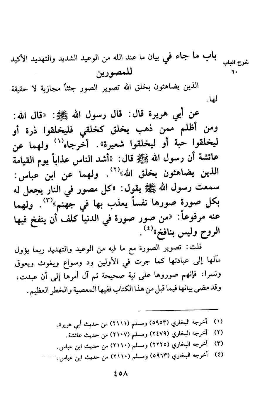 عن أبي هريرة قال: قال رسول الله صلى الله عليه وسلم: "قال الله: ومن أظلم ممن ذهب يخلق كخلقي فليخلقوا ذرة أو ليخلقوا حبة أو ليخلقوا شعيرة". أخرجاه1 ولهما عن عائشة أن رسول الله صلى الله عليه وسلم قال: "أشد الناس عذاباً يوم القيامة الذين يضاهئون بخلق الله" 2 ولهما عن ابن عباس: سمعت رسول الله صلى الله عليه وسلم يقول: "كل مصور في النار يجعل له بكل صورة صورها نفساً يعذب بها في جهنم" 3. ولهما عنه مرفوعاً: "من صور صورة في الدنيا كلف أن ينفخ فيها الروح، وليس بنافخ" 4.