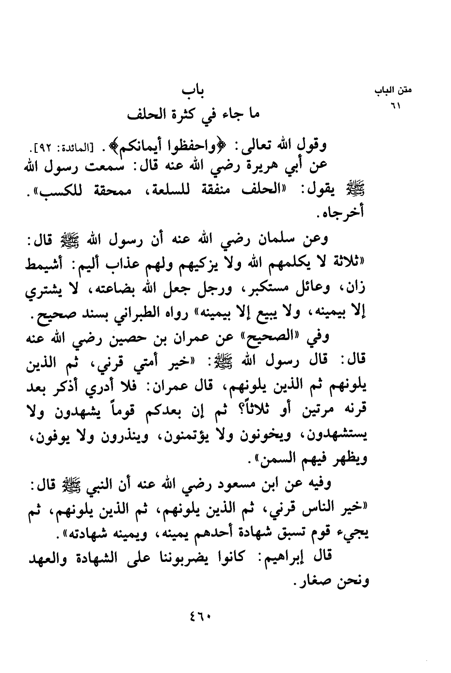 وفيه عن ابن مسعود رضي الله عنه أن النبي صلى الله عليه وسلم قال: "خير الناس قرني، ثم الذين يلونهم، ثم الذين يلونهم، ثم يجيء قوم تسبق شهادة أحدهم يمينه، ويمينه شهادته".