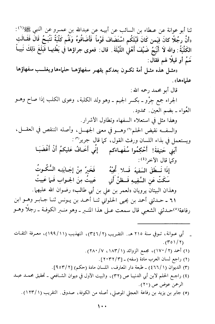 حَدَّثَنِي أَحْمَدُ بْنُ يَحْيَى الْحُلْوَانِيُّ، ثنا أَحْمَدُ بْنُ يُونُسَ، ثنا جَابِرٌ، وَهُوَ ابْنُ رِفَاعَةَ، حَدَّثَنِي الشَّعْبِيُّ، قَالَ: سَمِعْتُ عَلَى هَذَا الْمِنْبَرِ - وَهُوَ مِنْبَرُ الْكُوفَةِ - رَجُلًا وَهُوَ -[101]- يَقُولُ: سَمِعْتُ رَسُولَ اللَّهِ صَلَّى اللهُ عَلَيْهِ وَسَلَّمَ مَا سَمِعْتُ أَحَدًا يَقُولُهُ قَبْلَهُ، فَقَالَ لَهُ نُعَيْمٌ الْأَشْجَعِيُّ: مَنْ هُوَ يَا عَامِرُ؟ قَالَ: هُوَ النُّعْمَانُ بْنُ بَشِيرٍ الْأَنْصَارِيُّ، قَالَ: سَمِعْتُ رَسُولَ اللَّهِ صَلَّى اللهُ عَلَيْهِ وَسَلَّمَ يَقُولُ: " §إِنَّ مَثَلَ الْمُدَّهِنِ فِي أَمْرِ اللَّهِ كَمَثَلِ رَهْطٍ رَكِبُوا سَفِينَةً فَاقْتَرَعُوا عَلَى الْمَنَازِلِ فِيهَا، فَأَصَابَ بَعْضُهُمْ أَعْلَى السَّفِينَةِ، وَأَصَابَ بَعْضُهُمْ أَسْفَلَهَا، فَاطَّلَعَ مُطَّلِعٌ مِنَ الَّذِينَ أَعْلَى السَّفِينَةِ فَإِذَا بَعْضُ مَنْ فِي أَسْفَلِهَا يَخْرِقُهَا، قَالَ: مَا تَصْنَعُ يَا فُلَانُ؟ قَالَ: أَحْسِبُهُ قَالَ: أَخْرِقُ مَكَانًا فَأَسْتَقِي مِنْهُ"، أَوْ قَالَ أَشْرَبُ، فَقَالَ رَسُولُ اللَّهِ صَلَّى اللهُ عَلَيْهِ وَسَلَّمَ: «فَإِنْ غَيَّرُوا عَلَيْهِ نَجَا وَنَجَوْا، وَإِنْ تَرَكُوهُ يَخْرِقُهَا غَرِقَ وَغَرِقُوا» قَالَ نُعَيْمُ بْنُ أَبِي هِنْدٍ: إِنَّ هَذِهِ عَلَيْنَا شَدِيدَةٌ، أَنَا أَخَافُ أَنْ يَغْرِقَ هَؤُلَاءِ الْقَوْمُ وَيَغْرِقُوا، يَعْنِي بَنِي أُمَيَّةَ. قَالَ: وَهَذَا فِي زَمَانِ بَنِي أُمَيَّةَ حَدَّثَنِي أَبِي , وَمُحَمَّدُ بْنُ جُنَيْدٍ، قَالَ ابْنُ جُنَيْدٍ: ثنا عُقْبَةُ بْنُ مُكْرَمٍ، وَقَالَ أَبِي: ثنا يَحْيَى الْمُقَوِّمُ، قَالَا: ثنا أَبُو عَاصِمٍ، ثنا جَابِرُ بْنُ يَزِيدَ بْنِ رِفَاعَةَ الْعِجْلِيُّ، حَدَّثَنِي نُعَيْمُ بْنُ أَبِي هِنْدٍ، قَالَ: سَمِعْتُ الشَّعْبِيَّ، يَقُولُ: سَمِعْتُ النُّعْمَانَ بْنَ بَشِيرٍ، يَقُولُ: سَمِعْتُ رَسُولَ اللَّهِ صَلَّى اللهُ عَلَيْهِ وَسَلَّمَ يَقُولُ، فَذَكَرَ نَحْوَهُ حَدَّثَنَا ابْنُ ذَرِيحٍ الْعُكْبُرِيُّ، ثنا سُفْيَانُ بْنُ وَكِيعٍ، ثنا أَبُو بَكْرِ بْنُ عَيَّاشٍ، عَنْ مُغِيرَةَ، عَنِ الشَّعْبِيِّ، عَنِ النُّعْمَانِ بْنِ بَشِيرٍ، قَالَ: سَمِعْتُ رَسُولَ اللَّهِ صَلَّى اللهُ عَلَيْهِ وَسَلَّمَ يَقُولُ: «مَثَلُ الْمُقِيمِ عَلَى حُدُودِ اللَّهِ عَزَّ وَجَلَّ، وَالْمُدَّهِنِ فِي حُدُودِ اللَّهِ عَزَّ وَجَلَّ، وَالْمُنْهَمِكِ فِيهَا كَمَثَلِ ثَلَاثَةٍ فِي سَفِينَةٍ. . . . .» . وَذَكَرَ الْحَدِيثَ قَالَ أَبُو مُحَمَّدٍ رَحِمَهُ اللَّهُ تَعَالَى: الِادِّهَانُ: اللِّينُ، يُقَالُ: ادَّهَنَ الرَّجُلُ يَدَّهِنُ ادِّهَانًا فَهُوَ مُدَّهِنٌ، وَالْمُدَاهِنُ: الْمُصَانِعُ الْمُوَارِبُ قَالَ اللَّهُ تَعَالَى: {وَدُّوا لَوْ تُدْهِنُ فَيُدْهِنُونَ} [القلم: 9] . أَيْ تَلِينُ لَهُمْ فَيَلِينُونَ لَكَ. قَالَ شَاعِرٌ: