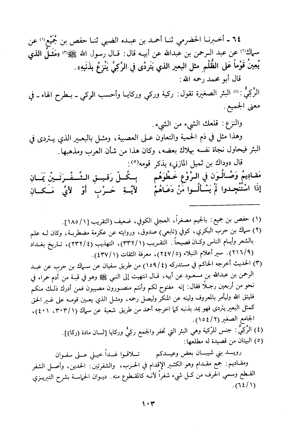 أَخْبَرَنَا الْحَضْرَمِيُّ، ثنا أَحْمَدُ بْنُ عَبْدَةَ الضَّبِّيُّ، ثنا حَفْصُ بْنُ جَمِيعٍ، عَنْ سِمَاكٍ، عَنْ عَبْدِ الرَّحْمَنِ بْنِ عَبْدِ اللَّهِ، عَنْ أَبِيهِ، قَالَ: قَالَ رَسُولُ اللَّهِ صَلَّى اللهُ عَلَيْهِ وَسَلَّمَ: «§مَثَلُ الَّذِي يُعِينُ قَوْمًا عَلَى الظُّلْمِ مَثَلُ الْبَعِيرِ الَّذِي يَتَرَدَّى فِي الرَّكِيِّ، يَنْزِعُ بِذَنَبِهِ» قَالَ أَبُو مُحَمَّدٍ رَحِمَهُ اللَّهُ: الرَّكِيُّ: الْبِئْرُ الصَّغِيرَةُ، تَقُولُ: رَكِيَّةٌ وَرَكِّيُّ وَرَكَايَا، وَأَحْسَبُ الرَّكِيَّ - بِطَرْحِ الْهَاءِ - فِي مَعْنَى الْجَمِيعِ، وَالنَّزْعُ: قَلْعُكَ الشَّيْءَ مِنَ الشَّيْءِ، وَهَذَا مَثَلٌ فِي ذَمِّ الْحَمِيَّةِ وَالتَّعَاوُنِ عَلَى الْعَصَبِيَّةِ وَمَثَّلَ بِالْبَعِيرِ الَّذِي يَتَرَدَّى فِي الْبِئْرِ فُيُحَاوُلُ نَجَاةَ نَفْسِهِ بِهَلَاكِ بَعْضِهِ، وَكَانَ هَذَا مِنْ شَأْنِ الْعَرَبِ وَمَذْهَبِهَا. قَالَ وَدَّاكُ بْنُ ثُمَيلٍ الْمَازِنِيُّ يَذْكُرُ قَوْمَهُ: