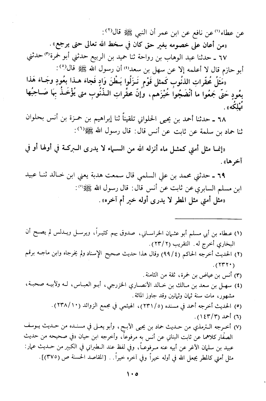 حَدَّثَنَا أَحْمَدُ بْنُ يَحْيَى الْحُلْوَانِيُّ تَلْقِينًا، ثَنَا إِبْرَاهِيمُ بْنُ حَمْزَةَ بْنِ أَنَسٍ بِحُلْوَانَ، ثنا حَمَّادُ بْنُ سَلَمَةَ، عَنْ ثَابِتٍ، عَنْ أَنَسٍ، قَالَ: قَالَ رَسُولُ اللَّهِ صَلَّى اللهُ عَلَيْهِ وَسَلَّمَ: «§إِنَّمَا مَثَلُ أُمَّتِي كَمَثَلِ مَا أَنْزَلَ اللَّهُ مِنَ السَّمَاءِ، لَا يُدْرَى الْبَرَكَةُ فِي أَوَّلِهَا أَوْ فِي آخِرِهَا»