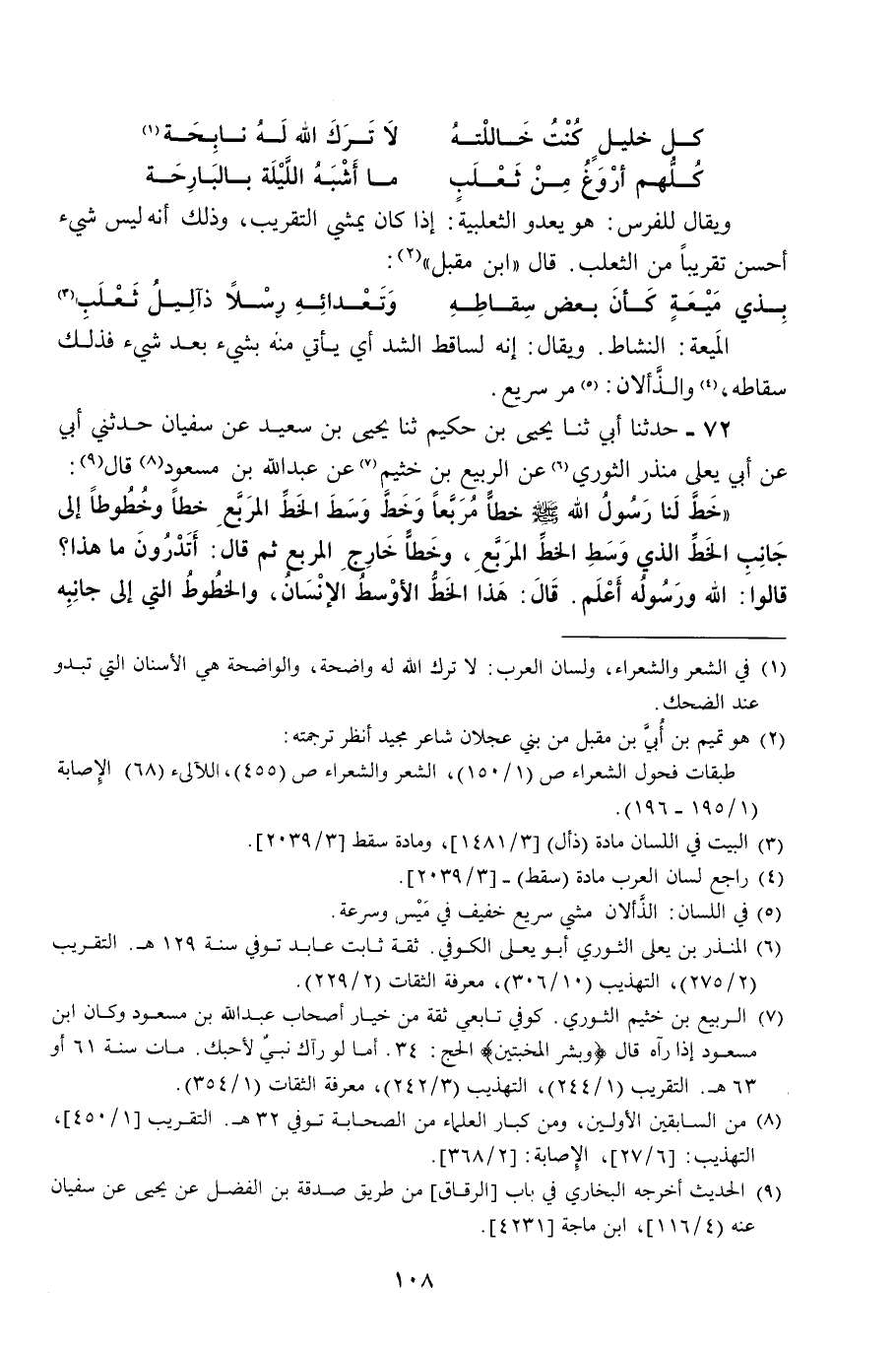 حَدَّثَنَا أَبِي، ثنا يَحْيَى بْنُ حَكِيمٍ، ثنا يَحْيَى بْنُ سَعِيدٍ، عَنْ سُفْيَانَ، حَدَّثَنِي أَبِي، عَنْ أَبِي يَعْلَى مُنْذِرٍ الثَّوْرِيِّ، عَنِ الرَّبِيعِ بْنِ خُثَيْمٍ، عَنْ عَبْدِ اللَّهِ بْنِ مَسْعُودٍ، قَالَ: §خَطَّ لَنَا رَسُولُ اللَّهِ صَلَّى اللهُ عَلَيْهِ وَسَلَّمَ خَطًّا مُرَبَّعًا، وَخَطَّ وَسَطَ الْخَطِّ الْمُرَبَّعِ خَطًّا وَخُطُوطًا إِلَى جَانِبِ الْخَطِّ الَّذِي وَسَطَ الْخَطِّ الْمُرَبَّعِ، وَخَطًّا خَارِجَ الْخَطِّ الْمُرَبَّعِ، ثُمَّ قَالَ: «أَتَدْرُونَ مَا هَذَا؟» . قَالُوا: اللَّهُ وَرَسُولُهُ أَعْلَمُ، قَالَ: " هَذَا الْخَطُّ الْأَوْسَطُ الْإِنْسَانُ، وَالْخُطُوطُ الَّتِي إِلَى جَانِبِهِ -[109]- الْأَعْرَاضُ، وَالْأَعْرَاضُ تَنْهَشُهُ مِنْ كُلِّ مَكَانٍ، إِذَا أَخْطَأَهُ هَذَا أَصَابَهُ هَذَا، وَالْخَطُّ الرَّابِعُ: الْأَجَلُ الْمُحِيطُ بِهِ، وَالْخَطُّ الْخَارِجُ الْبَعِيدُ: الْأَمَلُ "