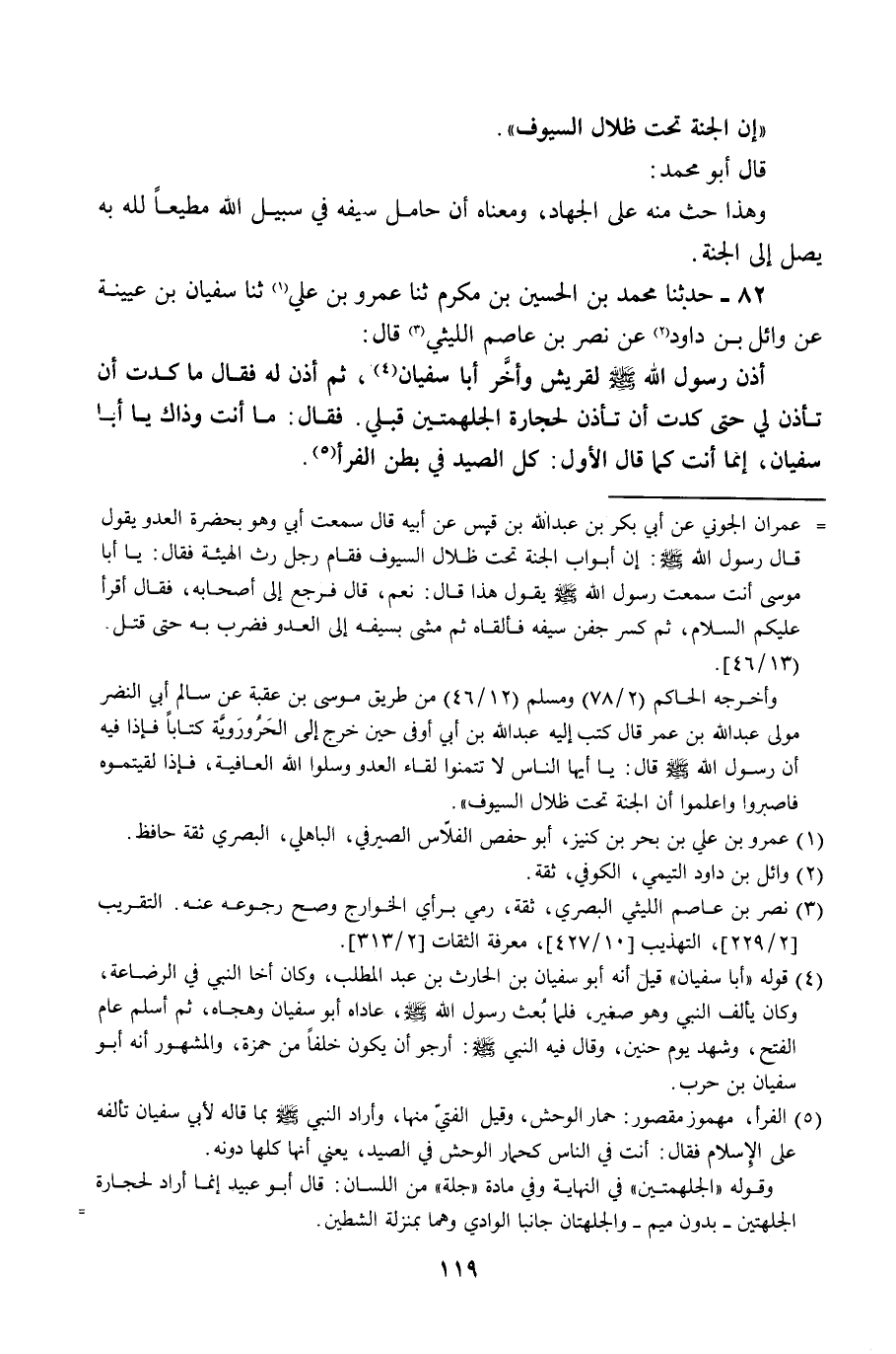 حَدَّثَنَا مُحَمَّدُ بْنُ الْحُسَيْنِ بْنِ مُكْرَمٍ، ثنا عَمْرُو بْنُ عَلِيٍّ، ثنا سُفْيَانُ بْنُ عُيَيْنَةَ، عَنْ وَائِلِ بْنِ دَاوُدَ، عَنْ نَصْرِ بْنِ عَاصِمٍ اللَّيْثِيِّ، قَالَ: أَذِنَ رَسُولُ اللَّهِ صَلَّى اللهُ عَلَيْهِ وَسَلَّمَ لِقُرَيْشٍ وَأَخَّرَ أَبَا سُفْيَانَ، ثُمَّ أَذِنَ لَهُ فَقَالَ: مَا كِدْتَ أَنْ تَأْذَنَ لِي حَتَّى كِدْتَ أَنْ تَأْذَنَ لِحِجَارَةِ الْجَلْهَمَتَيْنِ قَبْلِي. فَقَالَ: " مَا أَنْتَ وَذَاكَ يَا أَبَا سُفْيَانَ §إِنَّمَا أَنْتَ كَمَا قَالَ الْأَوَّلُ: كُلُّ الصَّيْدِ فِي بَطْنِ الْفَرَا "