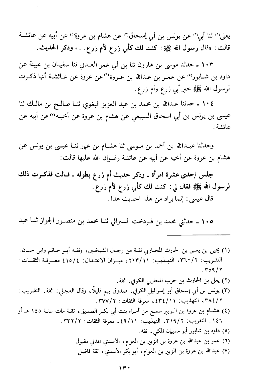 104 - حَدَّثَنَا عَبْدُ اللَّهِ بْنُ مُحَمَّدِ بْنِ عَبْدِ الْعَزِيزِ الْبَغَوِيُّ، ثنا صَالِحُ بْنُ مَالِكٍ، ثنا عِيسَى بْنُ يُونُسَ بْنِ أَبِي إِسْحَاقَ السَّبِيعِيُّ، عَنْ هِشَامِ بْنِ عُرْوَةَ، عَنْ أَخِيهِ، عَنْ أَبِيهِ، عَنْ عَائِشَةَ. وَحَدَّثَنَا عَبْدُ اللَّهِ بْنُ أَحْمَدَ بْنِ مُوسَى، ثنا هِشَامُ بْنُ عَمَّارٍ، ثنا عِيسَى بْنُ يُونُسَ، عَنْ هِشَامِ بْنِ عُرْوَةَ، عَنْ أَخِيهِ، عَنْ أَبِيهِ، عَنْ عَائِشَةَ رِضْوَانُ اللَّهِ عَلَيْهَا قَالَتْ: جَلَسَ إِحْدَى عَشْرَةَ امْرَأَةً - وَذَكَرَ حَدِيثَ أُمِّ زَرْعٍ بِطُولِهِ - قَالَتْ: فَذَكَرْتُ ذَلِكَ لِرَسُولِ اللَّهِ صَلَّى اللهُ عَلَيْهِ وَسَلَّمَ فَقَالَ لِي: «§كُنْتُ لَكِ كَأَبِي زَرْعٍ لِأُمِّ زَرْعٍ» قَالَ عِيسَى: إِنَّمَا يُرَادُ مِنْ هَذَا الْحَدِيثِ هَذَا