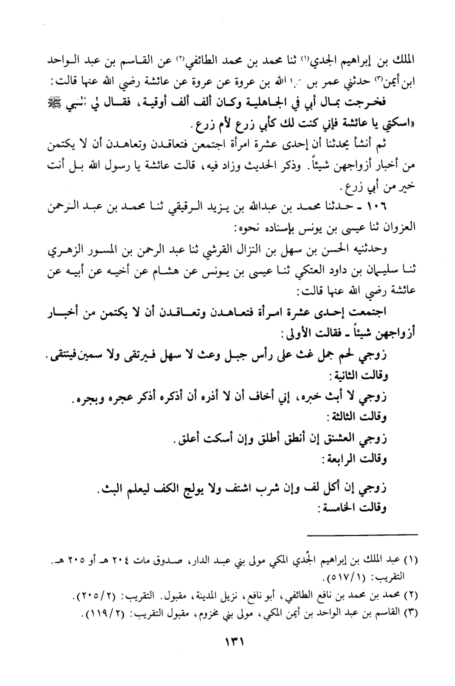 106 - حَدَّثَنَا مُحَمَّدُ بْنُ عَبْدِ اللَّهِ بْنِ يَزِيدَ الرَّقِيقِيُّ، ثنا مُحَمَّدُ بْنُ عَبْدِ الرَّحْمَنِ الْعَزَوَانِيُّ، ثنا عِيسَى بْنُ يُونُسَ، بِإِسْنَادِهِ نَحْوَهُ، وَحَدَّثَنِيهِ الْحَسَنُ بْنُ سَهْلِ بْنِ النَّزَّالِ الْقُرَشِيُّ، ثنا عَبْدُ الرَّحْمَنِ بْنُ الْمِسْوَرِ الزُّهْرِيُّ، ثنا سُلَيْمَانُ بْنُ دَاوُدَ الْعَتَكِيُّ، ثنا عِيسَى بْنُ يُونُسَ، عَنْ هِشَامٍ، عَنْ أَخِيهِ، عَنْ أَبِيهِ، عَنْ عَائِشَةَ، رَضِيَ اللَّهُ عَنْهَا قَالَتِ: " §اجْتَمَعَتْ إِحْدَى عَشْرَةَ امْرَأَةً فَتَعَاهَدْنَ وَتَعَاقَدْنَ أَنْ لَا يَكْتُمْنَ مِنْ أَخْبَارِ أَزْوَاجِهِنَّ شَيْئًا، فَقَالَتِ الْأُولَى: زَوْجِي لَحْمُ جَمَلٍ غَثٍّ، عَلَى رَأْسِ جَبَلٍ وَعْثٍ، لَا سَهْلٌ فَيُرْتَقَى، وَلَا سَمِينٌ فَيُنْتَقَى. وَقَالَتِ الثَّانِيَةُ: زَوْجِي لَا أَبُثُّ خَبَرَهُ، إِنِّي أَخَافُ أَنْ لَا أَذَرَهُ، إِنْ أَذْكُرْهُ أَذْكُرْ عُجَرَهُ وَبُجَرَهُ. وَقَالَتِ الثَّالِثَةُ: زَوْجِيَ الْعَشَنَّقُ، إِنْ أَنْطِقْ أُطَلَّقْ، وَإِنْ أَسْكُتْ أُعَلَّقْ. وَقَالَتِ الرَّابِعَةُ: زَوْجِي إِنْ أَكَلَ لَفَّ، وَإِنْ شَرِبَ اشْتَفَّ، وَلَا يُولِجُ الْكَفَّ، لِيَعْلَمَ الْبَثَّ. وَقَالَتِ الْخَامِسَةُ -[132]-: زَوْجِي غَيَايَاءُ، طَبَاقَاءُ، كُلُّ دَاءٍ لَهُ دَاءٌ، شَجَّكِ، أَوْ فَلَّكِ، أَوْ جَمَعَ كُلًّا لَكِ. وَقَالَتِ السَّادِسَةُ: زَوْجِيَ الْمَسُّ مَسُّ أَرْنَبٍ، وَالرِّيحُ رِيحُ زَرْنَبٍ. وَقَالَتِ السَّابِعَةُ: زَوْجِي كَلَيْلِ تِهَامَةَ، لَا حَرٌّ، وَلَا قُرٌّ، وَلَا مَخَافَةَ، وَلَا سَآمَةَ. وَقَالَتِ الثَّامِنَةُ: زَوْجِي إِنْ دَخَلَ فَهِدَ، وَإِنْ خَرَجَ أَسِدَ، وَلَا يَسْأَلُ عَمَّا عَهِدَ. قَالَتِ التَّاسِعَةُ: زَوْجِي رَفِيعُ الْعِمَادِ، عَظِيمُ الرَّمَادِ، طَوِيلُ النِّجَادِ، قَرِيبُ الْبَيْتِ مِنَ النَّادِ. قَالَتِ الْعَاشِرَةُ: زَوْجِي مَالِكٌ، فَمَا مَالِكٌ؟ مَالِكٌ خَيْرٌ مِنْ ذَلِكَ، لَهُ إِبِلٌ كَثِيرَاتُ الْمَبَارِكِ، قَلِيلَاتُ الْمَسَارِحِ، إِذَا سَمِعْنَ صَوْتَ الْمِزْهَرِ أَيْقَنَّ أَنَّهُنَّ هَوَالِكٌ. قَالَتِ الْحَادِيَةَ عَشَرةَ: زَوْجِي أَبُو زَرْعٍ، وَمَا أَبُو زَرْعٍ؟ أَنَاسَ مِنْ حُلِيٍّ أُذُنَيَّ، وَمَلَأ مِنْ شَحْمٍ عَضُدَيَّ، وَبَجَّحَنِي إِلَى نَفْسِي فَبَجَحَتْ، وَجَدَنِي فِي أَهْلِ غُنَيْمَةٍ بِشِقٍّ فَجَعَلَنِي فِي أَهْلِ صَهِيلٍ وَأَطِيطٍ وَدَائِسٍ وَمُنَقٍّ، فَعِنْدَهُ أَقُولُ فَلَا أُقَبَّحُ، وَأَشْرَبُ فَأَتَقَمَّحُ، وَأَرْقُدُ فَأَتَصَّبَّحُ. أُمُّ أَبِي زَرْعٍ، فَمَا أُمُّ أَبِي زَرْعٍ؟ عُكُومُهَا رَدَاحٌ، وَبَيْتُهَا فَسَاحٌ. ابْنُ أَبِي زَرْعٍ، وَمَا ابْنُ أَبِي زَرْعٍ؟ مَضْجَعُهُ كَمَسَلِّ الشَّطَبَةِ، وَيُشْبِعُهُ ذِرَاعُ الْجَفْرَةِ بِنْتُ أَبِي زَرْعٍ، فَمَا بِنْتُ أَبِي زَرْعٍ؟ طَوْعُ أَبِيهَا، وَطَوْعُ أُمِّهَا، وَمِلْءُ كِسَائِهَا، وَغَيْظُ جَارَتِهَا. جَارِيَةُ أَبِي زَرْعٍ، وَمَا جَارِيَةُ أَبِي زَرْعٍ؟ لَا تَبُثُّ حَدِيثَنَا تَبْثِيثًا، وَلَا تُنَقِّثُ مِيرَتَنَا تَنْقِيثًا، وَلَا تَمْلَأُ بَيْتَنَا تَعْشِيشًا. خَرَجَ أَبُو زَرْعٍ وَالْوِطَابُ تَمَخَّضُ، فَمَرَّ بِامْرَأَةٍ مَعَهَا وَلَدَانِ لَهَا يَلْعَبَانِ مِنْ تَحْتِ خَصْرِهَا بِرُمَّانَتَيْنِ فَطَلَّقَنِي وَنَكَحَهَا، فَتَزَوَّجْتُ بَعْدَهُ رَجُلًا سَرِيًّا، رَكِبَ شَرِيًّا، وَأَخَذَ خَطِّيًّا، وَأَرَاحَ عَلَيَّ نَعَمًا ثَرِيًّا، وَقَالَ: كُلِي أُمَّ زَرْعٍ، وَمِيرِي أَهْلَكِ، فَلَوْ جَمَعْتُ كُلَّ شَيْءٍ أَعْطَانِيهِ مَا بَلَغَ أَصْغَرَ آنِيَةِ أَبِي زَرْعٍ -[133]-. قَالَتْ عَائِشَةُ: فَقَالَ لِي رَسُولُ اللَّهِ صَلَّى اللهُ عَلَيْهِ وَسَلَّمَ: «كُنْتُ لَكِ كَأَبِ