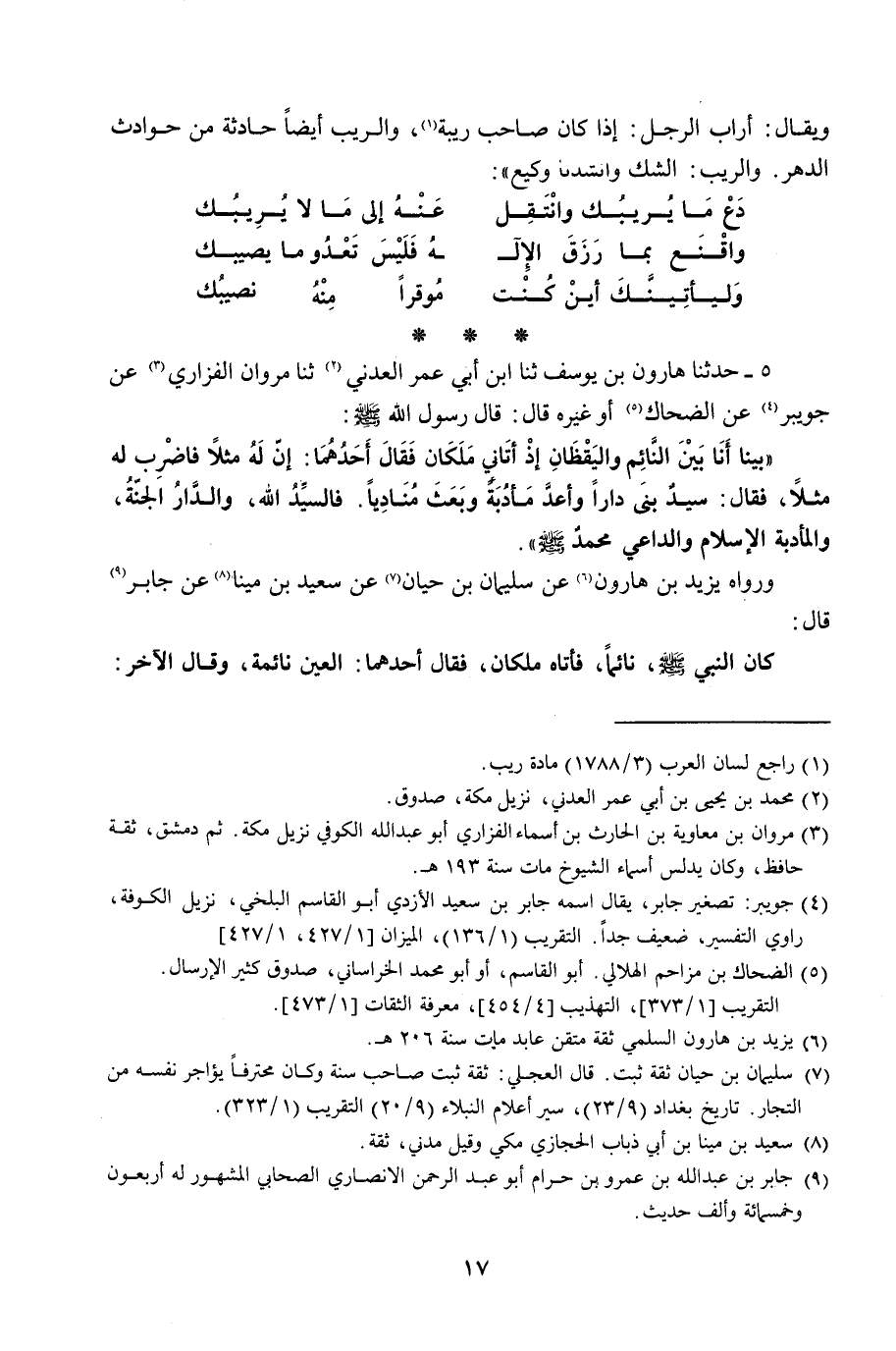 5 - حَدَّثَنَا هَارُونُ بْنُ يُوسُفَ، ثنا ابْنُ أَبِي عُمَرَ الْعَدَنِيُّ، ثنا مَرْوَانُ الْفَزَارِيُّ، عَنْ جُوَيْبِرٍ، عَنِ الضَّحَّاكِ، أَوْ غَيْرِهِ قَالَ: قَالَ رَسُولُ اللَّهِ صَلَّى اللهُ عَلَيْهِ وَسَلَّمَ: " §بَيْنَا أَنَا بَيْنَ النَّائِمِ وَالْيَقْظَانِ إِذْ أَتَانِي مَلَكَانِ، فَقَالَ أَحَدُهُمَا: إِنَّ لَهُ مَثَلًا فَاضْرِبْ لَهُ مَثَلًا، فَقَالَ: سَيِّدٌ بَنَى دَارًا، وَأَعَدَّ مَأْدُبَةً، وَبَعَثَ مُنَادِيًا، فَالسَّيُّدُ اللَّهُ، وَالدَّارُ الْجَنَّةُ، وَالْمَأْدُبَةُ الْإِسْلَامَ، وَالدَّاعِي مُحَمَّدٌ صَلَّى اللهُ عَلَيْهِ وَسَلَّمَ " وَرَوَاهُ يَزِيدُ بْنُ هَارُونَ، عَنْ سُلَيْمَانَ بْنِ حَيَّانَ، عَنْ سَعِيدِ بْنِ مِينَا، عَنْ جَابِرٍ قَالَ: كَانَ النَّبِيُّ صَلَّى اللهُ عَلَيْهِ وَسَلَّمَ نَائِمًا فَأَتَاهُ مَلَكَانِ، فَقَالَ أَحَدُهُمَا: الْعَيْنُ نَائِمَةٌ، وَقَالَ الْآخَرُ -[18]-: إِنَّ لَهُ مَثَلًا، وَذَكَرَ نَحْوًا مِنَ الْكَلَامِ الْأَوَّلِ. قَالَ لَنَا أَبُو مُحَمَّدٍ: الْمَأْدُبَةُ: الْوَلِيمَةُ وَفِي حَدِيثِ ابْنِ مَسْعُودٍ: «إِنَّ هَذَا الْقُرْآنَ مَأْدُبَةُ اللَّهِ» وَيُرْوَى مَأْدَبَةُ اللَّهِ، بِفَتْحِ الدَّالِ. قَالَ لِي أَبُو مُوسَى الْحَامِضُ: مَنْ رَوَى هَذَا بِضَمِّ الدَّالِ فَإِنَّمَا أَرَادَ الْوَلِيمَةَ، وَمَنْ رَوَاهَا بِفَتْحِ الدَّالِ أَرَادَ أَدَبَ اللَّهِ عَزَّ وَجَلَّ الَّذِي أَدَّبَ بِهِ عِبَادَهُ قَالَ أَبُو مُحَمَّدٍ: وَقَوْلُهُ: «الْقَلْبُ يَقْظَانُ» تَمْثِيلٌ، وَيُرَادُ بِهِ حَيَاةُ الْقَلْبِ وَصِحَّةُ خَوَاطِرِهِ، وَيُقَالُ: رَجُلٌ يَقِظٌ وَيَقُظٌ إِذَا كَانَ حَدِيدَ الْقَلْبِ ذَكِيَّهُ، وَهَذَا مَثَلٌ لَدَعْوَةِ النَّبِيِّ صَلَّى اللهُ عَلَيْهِ وَسَلَّمَ، وَالْفَوْزِ بِالِاسْتِجَابَةِ لَهَا، وَالْوُصُولِ إِلَى الْجَنَّةِ بِهَا: {وَاللَّهُ يَدْعُو إِلَى دَارِ السَّلَامِ وَيَهْدِي مَنْ يَشَاءُ إِلَى صِرَاطٍ مُسْتَقِيمٍ} [يونس: 25]
