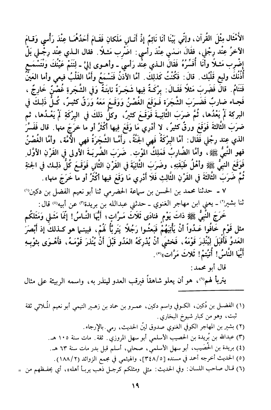 7 - حَدَّثَنَا مُحَمَّدُ بْنُ الْحَسَنِ بْنِ سَمَاعَةَ الْحَضْرَمِيُّ، ثنا أَبُو نُعَيْمٍ الْفَضْلُ بْنُ دُكَيْنٍ، ثنا بَشِيرٌ، يَعْنِي ابْنَ الْمُهَاجِرِ الْغَنَوِيَّ، حَدَّثَنِي عَبْدُ اللَّهِ بْنُ بُرَيْدَةَ، عَنْ أَبِيهِ، قَالَ: خَرَجَ النَّبِيُّ صَلَّى اللهُ عَلَيْهِ وَسَلَّمَ ذَاتَ يَوْمٍ فَنَادَى ثَلَاثَ مَرَّاتٍ: " أَيُّهَا النَّاسُ §إِنَّمَا مَثَلِي وَمَثَلُكُمْ مَثَلُ قَوْمٍ خَافُوا عَدُوًّا أَنْ يَأْتِيَهُمُ فَبَعَثُوا رَجُلًا يَتَرَبَّأُ لَهُمْ، فَبَيْنَمَا هُوَ كَذَلِكَ إِذْ أَبْصَرَ الْعَدُوَّ فَأَقْبَلَ لِيُنْذِرَ قَوْمَهُ فَخَشِيَ أَنْ يُدْرِكَهُ الْعَدُوُّ قَبْلَ أَنْ يَنْذِرَ قَوْمَهُ فَأَهْوَى بِثَوْبِهِ: أَيُّهَا النَّاسُ أُتِيتُمْ، ثَلَاثَ مَرَّاتٍ" قَالَ أَبُو مُحَمَّدٍ: يَتَرَبَّأُ لَهُمْ: هُوَ أَنْ يَعْلُوَ شَاهِقًا فَيَرْقُبَ الْعَدُوَّ لِيُنْذِرَ بِهِ، وَاسْمُهُ الرَّبِيئَةُ عَلَى مِثَالِ -[20]- فَعِيلَةُ، مَهْمُوزٌ، وَهُوَ الَّذِي يُقَالُ لَهُ: الدَّيْدَبَانُ قَالَ عُبَيْدُ اللَّهِ بْنُ ثَعْلَبَةَ الْيَشْكُرِيُّ:
