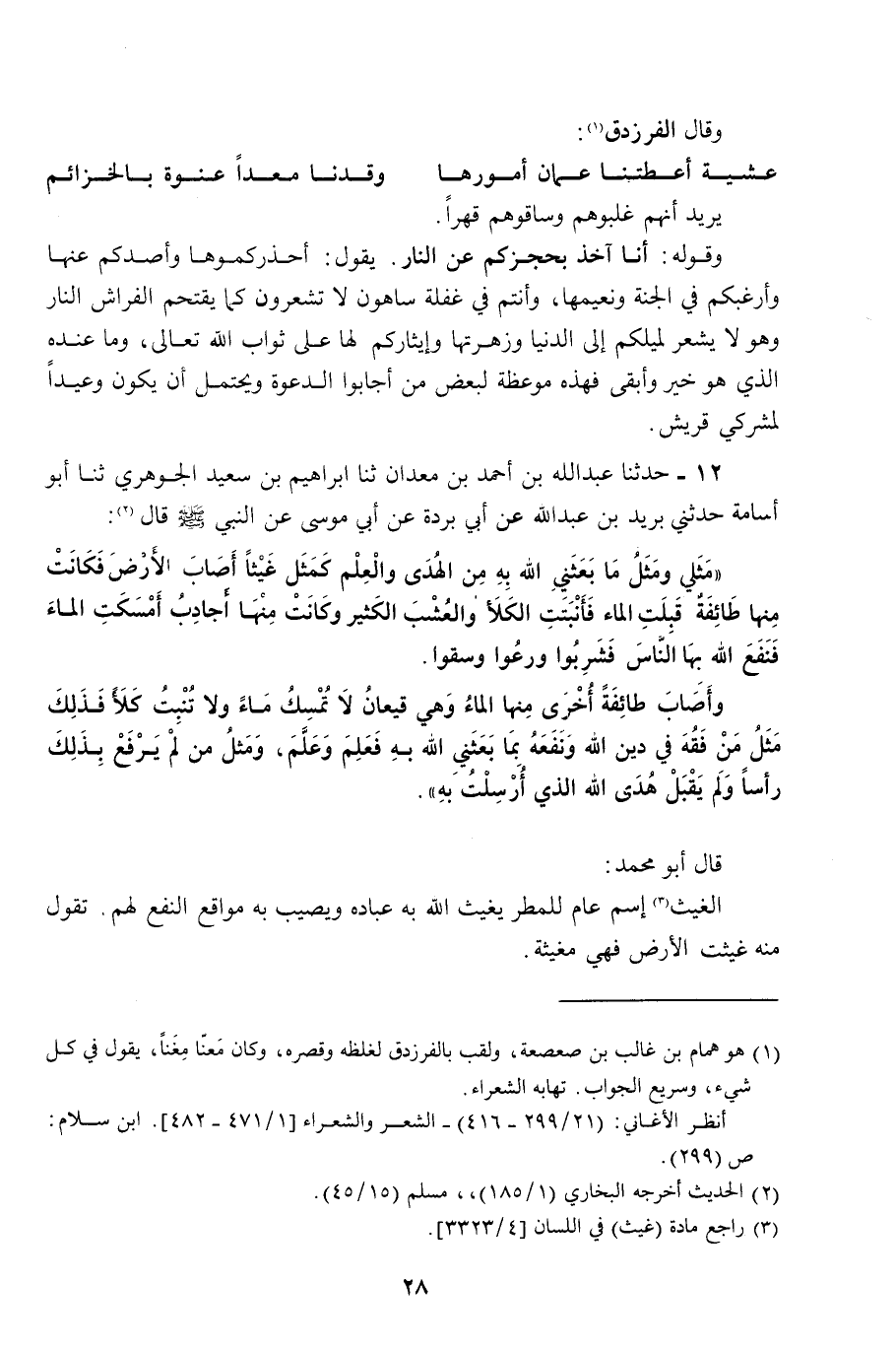 12 - حَدَّثَنَا عَبْدُ اللَّهِ بْنُ أَحْمَدَ بْنِ مَعْدَانَ، ثنا إِبْرَاهِيمُ بْنُ سَعِيدٍ الْجَوْهَرِيُّ، ثنا أَبُو أُسَامَةَ، حَدَّثَنِي بُرَيْدُ بْنُ عَبْدِ اللَّهِ، عَنْ أَبِي بُرْدَةَ، عَنْ أَبِي مُوسَى، عَنِ النَّبِيِّ صَلَّى اللهُ عَلَيْهِ وَسَلَّمَ قَالَ: «§مَثَلِي وَمَثَلُ مَا بَعَثَنِي اللَّهُ بِهِ مِنَ الْهُدَى وَالْعِلْمِ كَمَثَلِ غَيْثٍ أَصَابَ الْأَرْضَ، فَكَانَتْ مِنْهَا طَائِفَةٌ قَبِلَتِ الْمَاءَ فَأَنْبَتَتِ الْكَلَأَ وَالْعُشْبَ الْكَثِيرَ، وَكَانَتْ مِنْهَا أَجَادِبُ أَمْسَكَتِ الْمَاءَ، فَنَفَعَ اللَّهُ بِهَا النَّاسَ فَشَرِبُوا وَرَعَوْا وَسَقَوْا، وَأَصَابَ طَائِفَةً أُخْرَى مِنْهَا الْمَاءُ، وَهِيَ قِيعَانٌ لَا تُمْسِكُ مَاءً وَلَا تَنْبُتُ كَلَأً، فَذَلِكَ مَثَلُ مَنْ فَقِهَ فِي دِينِ اللَّهِ وَنَفَعَهُ مَا بَعَثَنِي اللَّهُ بِهِ فَعَلِمَ وَعَلَّمَ، وَمَثَلُ مَنْ لَمْ يَرْفَعْ بِذَلِكَ رَأْسًا وَلَمْ يَقْبَلْ هُدَى اللَّهِ الَّذِي أُرْسِلْتُ بِهِ» قَالَ أَبُو مُحَمَّدٍ: الْغَيْثُ اسْمٌ عَامٌّ لِلْمَطَرِ يُغِيثُ اللَّهُ بِهِ عِبَادَهُ، وَيُصِيبُ بِهِ مَوَاقِعَ النَّفْعِ لَهُمْ، تَقُولُ مِنْهُ: غَيَثَتِ الْأَرْضُ فَهِيَ مُغِيثَةٌ -[29]-، وَالْكَلَأُ: الْحَشِيشُ، قَالَ صَاحِبُ كِتَابِ الْعَيْنِ: هُوَ اسْمٌ لِرَطْبِهِ وَيَابِسِهِ. قَالَ: وَالْعُشْبُ لَا يَكُونُ إِلَّا رَطْبًا وَقَالَ أَبُو زَيْدٍ الْأَنْصَارِيُّ: الْكَلَأُ كُلُّهُ مَا دَامَ رَطْبًا عُشْبُهُ وَبَقْلُهُ، وَهُوَ مَهْمُوزٌ، وَالْجَمْعُ الْأَكْلَاءُ مَمْدُودٌ، يُقَالُ: أَكْلَأَتِ الْأَرْضُ فَهِيَ مُكْلِئَةٌ، وَأَكْلَأَتِ الْأَرْضُ وَأَعْشَبَتْ، وَأَكْلَأَ الْمَالُ وَأَعْشَبَ، وَالنَّاسُ مُكْلِئُونَ وَمُعْشِبُونَ، وَقَدْ بَدَأَ الْإِكْلَاءُ وَالْإِعْشَابُ وَالْإِبْقَالُ، فَأَمَّا ذَكَارُ الْكَلَأِ فَعُشْبٌ وَهُوَ مَا غَلُظَ مِنْهُ وَعَظُمَ، وَالْبَقْلُ مَا لَانَ مِنْهُ وَدَقَّ وَهَذَا مَثَلٌ لِلنَّبِيِّ صَلَّى اللهُ عَلَيْهِ وَسَلَّمَ فِي إِبْلَاغِهِ عَنِ اللَّهِ عَزَّ وَجَلَّ، وَدُعَائِهِ إِلَى سَبِيلِهِ، وَأَنَّهُ بُعِثَ رَحْمَةً لِلْعَالَمِينَ لِيُخْرِجَهُمْ مِنَ الظُّلُمَاتِ إِلَى النُّورِ، وَيَهْدِيَهُمْ إِلَى صِرَاطٍ مُسْتَقِيمٍ، وَمَثَّلَ ذَلِكَ بِالْغَيْثِ الَّذِي يَنْشُرُ اللَّهُ بِهِ رَحْمَتَهُ فِي الْأَرْضِ وَيُحْيِي بِهِ الْأَنْعَامَ وَالْحَرْثَ، وَالَّذِينَ اسْتَمَعُوا قَوْلَهُ وَشَاهَدُوا أَمْرَهُ فِي اخْتِلَافِ مَذَاهِبِهِمْ وَطَرَائِقِهِمْ بِبِقَاعِ الْأَرْضِ الَّتِي يَخْتَلِفُ تُرْبُهَا وَأَمَاكِنُهَا، فَمِنْهَا ذَاتُ الرِّيَاضِ الْمُعْشِبَةِ الْكَثِيفَةِ الَّتِي يَكْثُرُ خَيْرُهَا وَيَعُمُّ نَفْعُهَا، وَمِنْهَا الْأَمَاكِنُ ذَاتُ الْغِيَاضِ وَالْغُدْرَانِ وَالنُّقْرِ وَالْقِلَاتِ، وَغَيْرُ ذَلِكَ مِنَ الْأَمَاكِنِ الَّتِي يَسْتَنْقِعُ فِيهَا الْمَاءُ فَيَرِدُ إِلَيْهَا النَّاسُ وَالْأَنْعَامُ، وَمِنْهَا مَا لَا يَتَعَلَّقُ مِنَ الْمَطَرِ إِلَّا بِمُرُورِهِ عَلَيْهِ، وَهُوَ مَثَلٌ لِمَنْ فَقِهَ عَنِ اللَّهِ عَزَّ وَجَلَّ وَتَفَقَّهَ لِمَا أَمَرَ بِهِ الرَّسُولُ صَلَّى اللهُ عَلَيْهِ وَسَلَّمَ فَعَلِمَ وَعَلَّمَ وَعَمِلَ، وَمَثَلٌ لِلْحَامِلِ -[30]- عَلِمَهُ إِلَى مَنْ هُوَ أَوْعَى مِنْهُ، كَمَا قَالَ فِي الْحَدِيثِ الْآخَرِ «فَرُبَّ حَامِلِ فِقْهٍ إِلَى مَنْ هُوَ أَفْقَهُ مِنْهُ» وَمَثَلٌ لِلسَّامِعِ الْمُعْرِضِ الْمَحْرُومِ. وَالْأَجَادِبُ - فِيمَا أَحْسَبُ - جَمْعُ أَجْدَابَ، أَوْ يَكُونُ جَمْعًا لِأَجْدَبَ، وَهَذَا - فِيمَا أَحْسَبُ وَلَا أُحَقِّقُ - سَمِعْتُ الزَّجَّاجَ يَقُولُ: جَدَبَتِ الْأَرْضُ وَأَجْدَبَتْ إِذَا لَمْ تُنْبِتْ شَيْئًا 