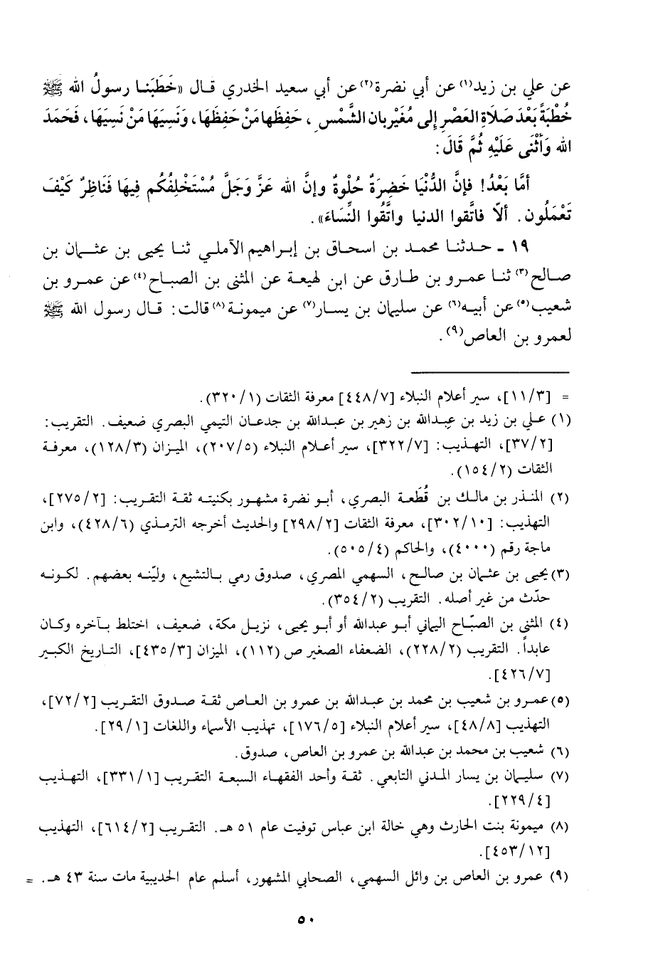 19 - حَدَّثَنَا مُحَمَّدُ بْنُ إِسْحَاقَ بْنِ إِبْرَاهِيمَ الْآمُلِيُّ، ثنا يَحْيَى بْنُ عُثْمَانَ بْنِ صَالِحٍ، ثنا عَمْرُو بْنُ طَارِقٍ، عَنِ ابْنِ لَهِيعَةَ، عَنِ الْمُثَنَّى بْنِ الصَّبَّاحِ، عَنْ عَمْرِو بْنِ شُعَيْبٍ، عَنْ أَبِيهِ، عَنْ سُلَيْمَانَ بْنِ يَسَارٍ، عَنْ مَيْمُونَةَ، قَالَتْ: قَالَ رَسُولُ اللَّهِ صَلَّى اللهُ عَلَيْهِ وَسَلَّمَ لِعَمْرِو بْنِ الْعَاصِ -[51]-: «§الدُّنْيَا خَضِرَةٌ حُلْوَةٌ، فَمَنِ اتَّقَى اللَّهَ فِيهَا وَأَصْلَحَ، وَإِلَّا فَهُوَ كَالْآكِلِ وَلَا يَشْبَعُ، وَبَيْنَ النَّاسِ فِي ذَلِكَ كَبُعْدِ الْكَوْكَبَيْنِ، أَحَدُهُمَا يَطْلُعُ فِي الْمَشْرِقِ، وَالْآخَرُ يَغِيبُ فِي الْمَغْرِبِ» قَالَ أَبُو مُحَمَّدٍ: سَأَلْتُ بَعْضَ شُيُوخِنَا عَنْ قَوْلِهِ: «الدُّنْيَا خَضِرَةٌ حُلْوَةٌ» ، عَلَى مَا يَقَعُ هَذَانِ الْمَعْنَيَانِ؟ فَقَالَ: مَعْنَاهُ إِنَّ مَا عَلَى ظَهْرِهَا مِنْ مَتَاعِهَا يَحْسُنُ فِي عُيُونِ أَهْلِهَا، وَيَحْلُو فِي صُدُورِهِمْ، كَمَا قَالَ اللَّهُ عَزَّ وَجَلَّ: {زُيِّنَ لِلنَّاسِ حُبُّ الشَّهَوَاتِ مِنَ النِّسَاءِ وَالْبَنِينَ وَالْقَنَاطِيرِ الْمُقَنْطَرَةِ مِنَ الذَّهَبِ وَالْفِضَّةِ وَالْخَيْلِ الْمُسَوَّمَةِ وَالْأَنْعَامِ وَالْحَرْثِ، ذَلِكَ مَتَاعُ الْحَيَاةِ الدُّنْيَا، وَاللَّهُ عِنْدَهُ حُسْنُ الْمَآبِ} [آل عمران: 14] . وَأَنْشَدَ: