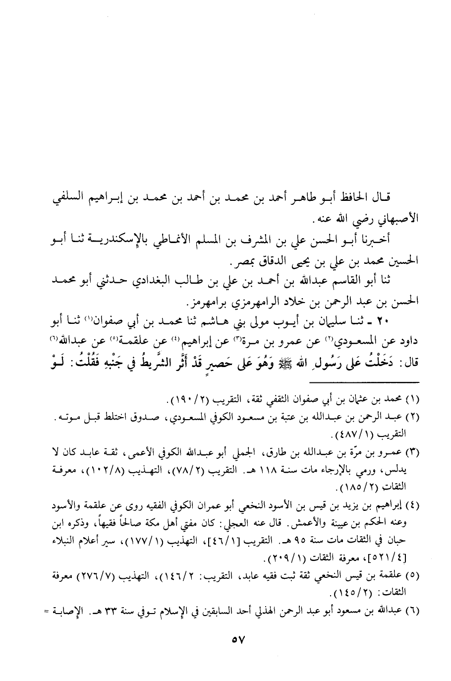 قَالَ الْحَافِظُ أَبُو طَاهِرٍ أَحْمَدُ بْنُ مُحَمَّدِ بْنِ أَحْمَدَ بْنِ مُحَمَّدِ بْنِ إِبْرَاهِيمَ السِّلَفِيُّ الْأَصْبَهَانِيُّ رَضِيَ اللَّهُ عَنْهُ: أَخْبَرَنَا أَبُو الْحَسَنِ عَلِيُّ بْنُ الْمُشَرَّفِ بْنِ الْمُسْلِمِ الْأَنْمَاطِيُّ بِالْإِسْكَنْدَرَيَّةِ، ثنا أَبُو الْحُسَيْنِ مُحَمَّدُ بْنُ عَلِيِّ بْنِ يَحْيَى الدَّقَّاقُ بِمِصْرَ، ثنا أَبُو الْقَاسِمِ عَبْدُ اللَّهِ بْنُ أَحْمَدَ بْنِ عَلِيِّ بْنِ طَالِبٍ الْبَغْدَادِيُّ، حَدَّثَنِي أَبُو مُحَمَّدٍ الْحَسَنُ بْنُ عَبْدِ الرَّحْمَنِ بْنِ خَلَّادٍ الرَّامَهُرْمُزِيُّ بِرَامَهُرْمُزَ، ثنا سُلَيْمَانُ بْنُ أَيُّوبَ، مَوْلَى بَنِي هَاشِمٍ، ثنا مُحَمَّدُ بْنُ أَبِي صَفْوَانَ، ثنا أَبُو دَاوُدَ، عَنِ الْمَسْعُودِيِّ، عَنْ عَمْرِو بْنِ مُرَّةَ، عَنْ إِبْرَاهِيمَ، عَنْ عَلْقَمَةَ، عَنْ عَبْدِ اللَّهِ، قَالَ: دَخَلْتُ عَلَى رَسُولِ اللَّهِ صَلَّى اللهُ عَلَيْهِ وَسَلَّمَ وَهُوَ عَلَى حَصِيرٍ قَدْ أَثَّرَ الشَّرِيطُ فِي جَنْبِهِ فَقُلْتُ: لَوْ -[58]- نِمْتَ يَا رَسُولَ اللَّهِ عَلَى مَا هُو أَلْيَنُ مِنْ هَذَا، فَقَالَ: «مَا لِي وَلِلدُّنْيَا، §إِنَّمَا مَثَلِي وَمَثَلُ الدُّنْيَا كَمَثَلِ رَاكِبٍ مَرَّ بِأَرْضِ فَلَاةٍ فَرَأَى شَجَرَةً فَاسْتَظَلَّ تَحْتَهَا ثُمَّ رَاحَ وَتَرْكَهَا» هَذَا مَثَلٌ فِي سُرْعَةِ انْقِطَاعِ الدُّنْيَا بِصَاحِبِهَا، وَإِنَّ الْكَائِنَ وَاقِعٌ. وَقَالَ الْعَدَوِيُّ: