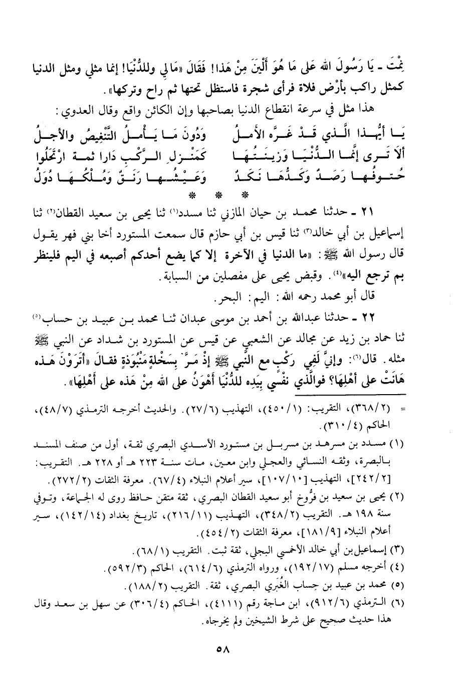 حَدَّثَنَا مُحَمَّدُ بْنُ حَيَّانَ الْمَازِنِيُّ، ثنا مُسَدَّدٌ، ثنا يَحْيَى بْنُ سَعِيدٍ الْقَطَّانُ، ثنا إِسْمَاعِيلُ بْنُ أَبِي خَالِدٍ، ثنا قَيْسُ بْنُ أَبِي حَازِمٍ، قَالَ: سَمِعْتُ الْمُسْتَوْرِدَ، أَخَا بَنِي فِهْرٍ يَقُولُ: قَالَ رَسُولُ اللَّهِ صَلَّى اللهُ عَلَيْهِ وَسَلَّمَ: «§مَا الدُّنْيَا فِي الْآخِرَةِ إِلَّا كَمَا يَضَعُ أَحَدُكُمْ إِصْبَعَهُ فِي الْيَمِّ، فَلْيَنْظُرْ بِمَ تَرْجِعُ إِلَيْهِ» وَقَبَضَ يَحْيَى عَلَى مِفْصَلَيْنِ مِنَ السَّبَّابَةِ، قَالَ أَبُو مُحَمَّدٍ رَحِمَهُ اللَّهُ: الْيَمُّ: الْبَحْرُ