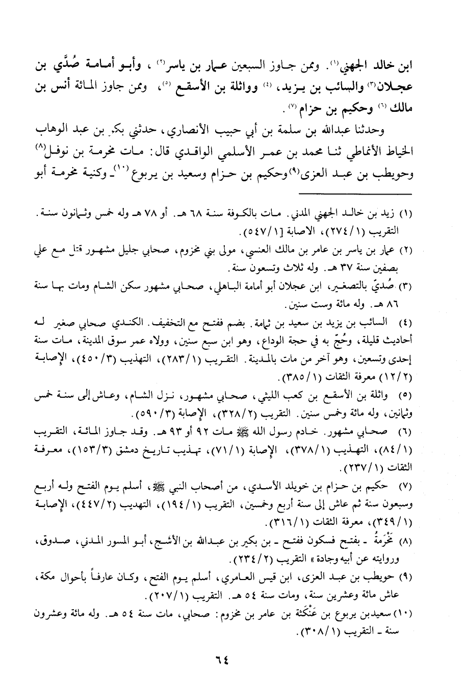 وَحَدَّثَنَا عَبْدُ اللَّهِ بْنُ سَلَمَةَ بْنِ أَبِي حَبِيبٍ الْأَنْصَارِيُّ، حَدَّثَنِي بَكْرُ بْنُ عَبْدِ الْوَهَّابِ الْخَيَّاطُ الْأَنْمَاطِيُّ، ثنا مُحَمَّدُ بْنُ عُمَرَ الْأَسْلَمِيُّ الْوَاقِدِيُّ قَالَ: " §مَاتَ مَخْرَمَةُ بْنُ نَوْفَلٍ، وَحُوَيْطِبُ بْنُ عَبْدِ الْعُزَّى، وَحَكِيمُ بْنُ حِزَامٍ، وَسَعِيدُ بْنُ يَرْبُوعٍ - وَكُنْيَةُ مَخْرَمَةَ: أَبُو -[65]- الْمِسْوَرِ، وَكُنْيَةُ حَكِيمٍ: أَبُو خَالِدٍ، وَكُنْيَةُ حُوَيْطِبٍ: أَبُو مُحَمَّدٍ - مَاتُوا سَنَةَ أَرْبَعٍ وَخَمْسِينَ، وَقَدْ بَلَغَ كُلُّ وَاحِدٍ مِنْهُمْ عِشْرِينَ وَمِائَةَ سَنَةٍ، إِلَّا مَخْرَمَةَ فَإِنَّهُ بَلَغَ خَمْسَ عَشْرَةَ وَمِائَةً. وَمَاتَ أَنَسُ بْنُ مَالِكٍ سَنَةَ إِحْدَى وَتِسْعِينَ، وَقَالَ: قَدِمَ النَّبِيُّ صَلَّى اللهُ عَلَيْهِ وَسَلَّمَ الْمَدِينَةَ وَلِي عَشْرُ سِنِينَ، فَذَلِكَ مِائَةُ سَنَةٍ وَسَنَةٌ وَاحِدَةٌ "