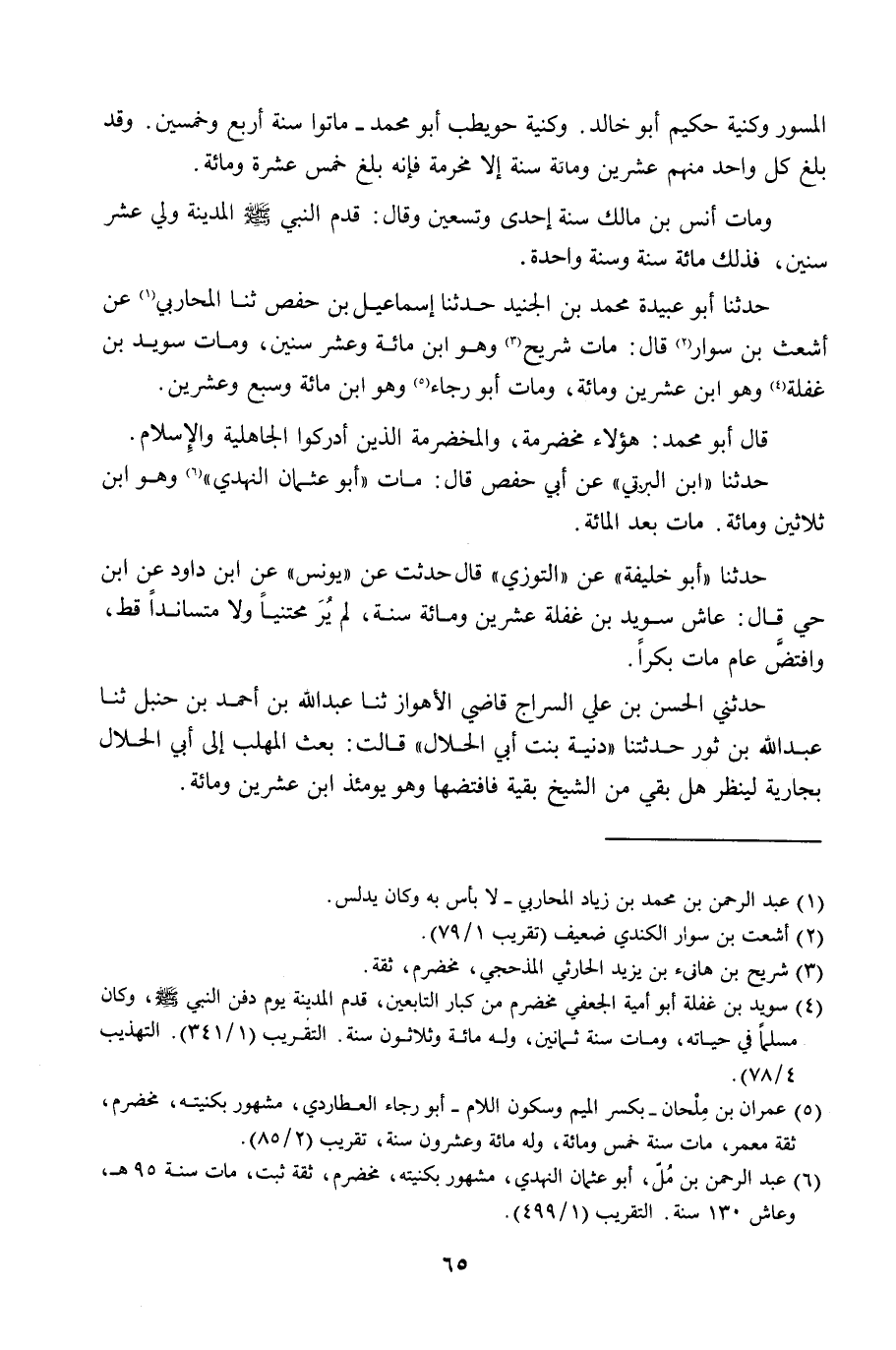 حَدَّثَنَا أَبُو عُبَيْدَةَ مُحَمَّدُ بْنُ الْجُنَيْدِ، حَدَّثَنَا إِسْمَاعِيلُ بْنُ حَفْصٍ، ثنا الْمُحَارِبِيُّ، عَنْ أَشْعَثَ بْنِ سَوَّارٍ قَالَ: «§مَاتَ شُرَيْحٌ وَهُوَ ابْنُ مِائَةٍ وَعَشْرِ سِنِينَ، وَمَاتَ سُوَيْدُ بْنُ غَفَلَةَ وَهُوَ ابْنُ عِشْرِينَ وَمِائَةٍ وَمَاتَ أَبُو رَجَاءٍ وَهُوَ ابْنُ مِائَةٍ وَسَبْعٍ وَعِشْرِينَ» قَالَ أَبُو مُحَمَّدٍ: هَؤُلَاءِ مُخَضْرِمَةٌ، وَالْمُخَضْرِمَةُ: الَّذِينَ أَدْرَكُوا الْجَاهِلِيَّةَ وَالْإِسْلَامَ