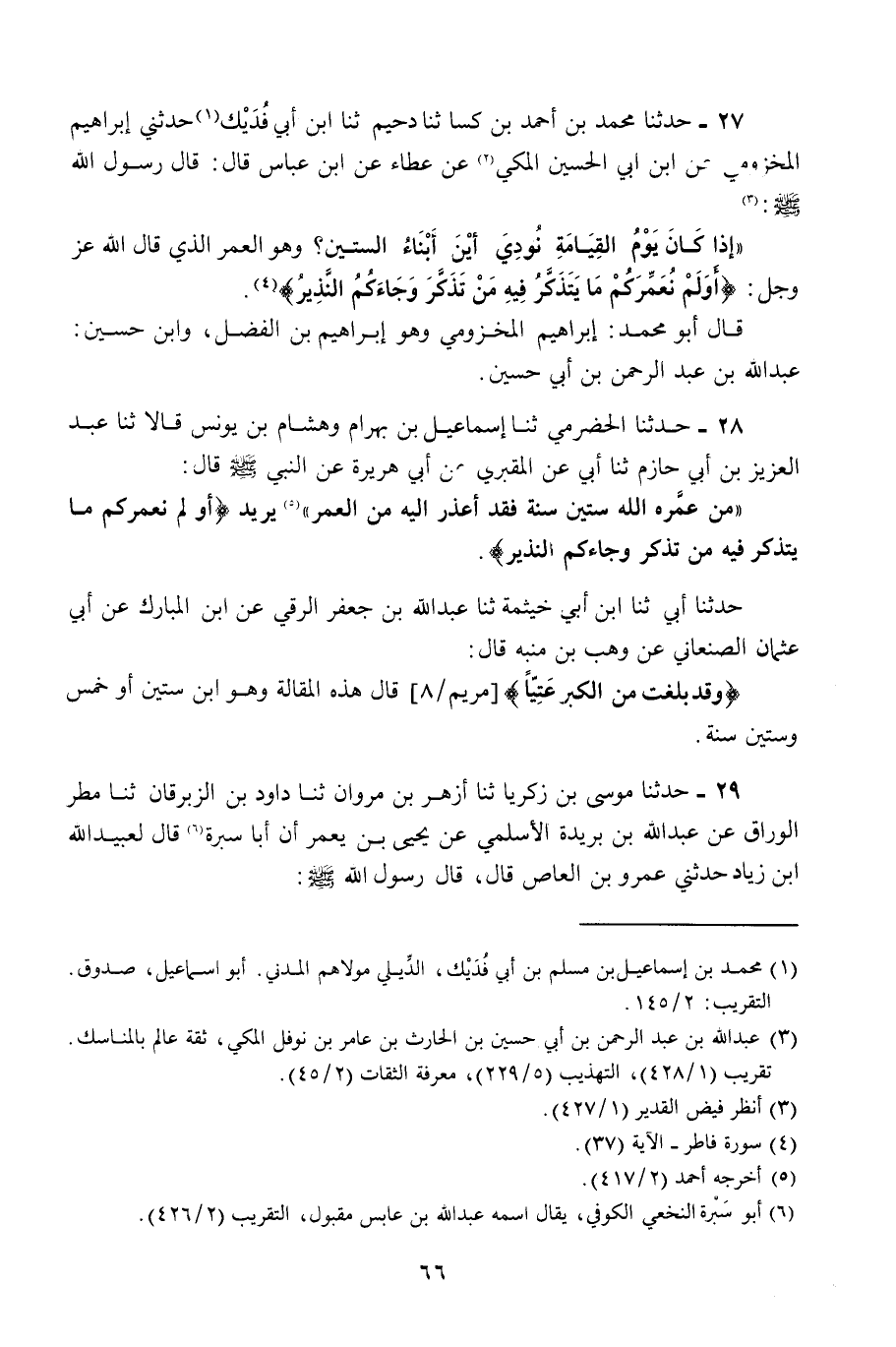 حَدَّثَنَا مُحَمَّدُ بْنُ أَحْمَدَ بْنِ كَسَا، ثنا دُحَيْمٌ، ثنا ابْنُ أَبِي فُدَيْكٍ، حَدَّثَنِي إِبْرَاهِيمُ الْمَخْزُومِيُّ، عَنِ ابْنِ أَبِي حُسَيْنٍ الْمَكِّيِّ، عَنْ عَطَاءٍ، عَنِ ابْنِ عَبَّاسٍ، قَالَ: قَالَ رَسُولُ اللَّهِ صَلَّى اللهُ عَلَيْهِ وَسَلَّمَ: " §إِذَا كَانَ يَوْمُ الْقِيَامَةِ نُودِيَ: أَيْنَ أَبْنَاءُ السِّتِّينَ؟ وَهُوَ الْعُمُرُ الَّذِي قَالَ اللَّهُ عَزَّ وَجَلَّ: {أَوَلَمْ نُعَمِّرْكُمْ مَا يَتَذَكَّرُ فِيهِ مَنْ تَذَكَّرَ وَجَاءَكُمُ النَّذِيرُ} [فاطر: 37] " قَالَ أَبُو مُحَمَّدٍ: إِبْرَاهِيمُ الْمَخْزُومِيُّ، وَهُوَ إِبْرَاهِيمُ بْنُ الْفَضْلِ، وَابْنُ أَبِي حُسَيْنٍ: عَبْدُ اللَّهِ بْنُ عَبْدِ الرَّحْمَنِ بْنِ أَبِي حُسَيْنٍ