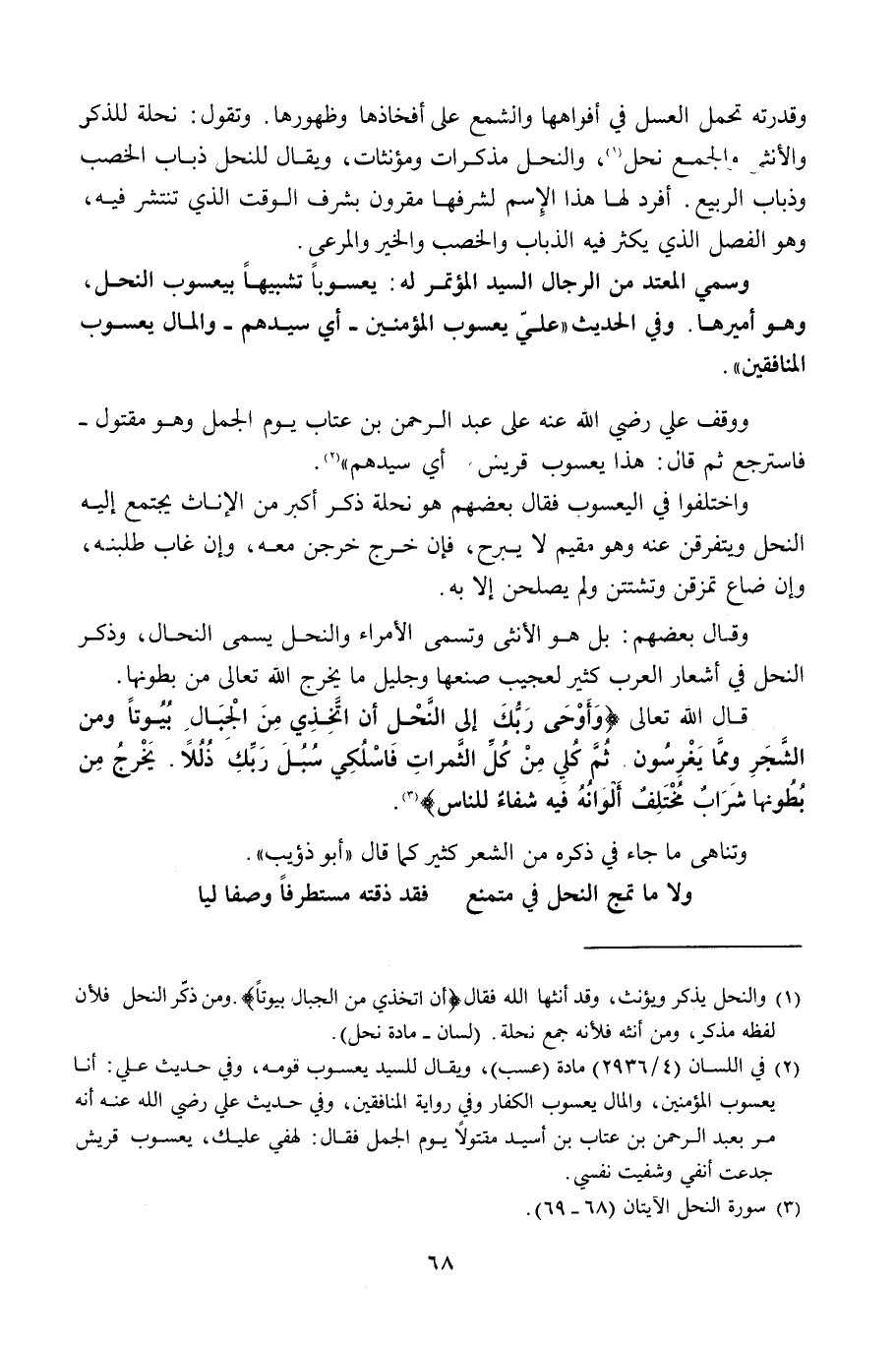 وَقُدْرَتِهِ تَحْمِلُ الْعَسَلَ فِي أَفْوَاهِهَا، وَالشَّمْعَ عَلَى أَفْخَاذِهَا وَظُهُورِهَا. وَتَقُولُ: نَحْلَةٌ لِلذَّكَرِ وَالْأُنْثَى، وَالْجَمْعُ نَحْلٌ، وَالنَّحْلُ مُذَكَّرَاتٌ وَمُؤَنَّثَاتٌ، وَيُقَالُ لِلنَّحْلِ: ذُبَابُ الْخِصْبِ، وَذُبَابُ الرَّبِيعِ. أُفْرِدَ لَهَا هَذَا الِاسْمُ لِشَرَفِهَا، مَقْرُونٌ بِشَرَفِ الْوَقْتِ الَّذِي تَنْتَشِرُ فِيهِ، وَهُوَ الْفَصْلُ الَّذِي يَكْثُرُ فِيهِ الذُّبَابُ وَالْخِصْبُ وَالْخَيْرُ وَالْمَرْعَى. وَسُمِّيَ الْمُعْتَدُ مِنَ الرِّجَالِ السَّيِّدُ الْمُؤْتَمِرُ لَهُ يَعْسُوبًا تَشْبِيهًا بِيَعْسُوبِ النَّحْلِ، وَهُوَ أَمِيرُهَا. وَفِي الْحَدِيثِ: «عَلَيٌ يَعْسُوبُ الْمُؤْمِنِينَ» . أَيْ سَيِّدُهُمْ. وَالْمَالُ يَعْسُوبُ الْمُنَافِقِينَ. وَوَقَفَ عَلِيُّ رَضِيَ اللَّهُ عَنْهُ عَلَى عَبْدِ الرَّحْمَنِ بْنِ عَتَّابٍ يَوْمَ الْجَمَلِ وَهُوَ مَقْتُولٌ، فَاسْتَرْجَعَ ثُمَّ قَالَ: هَذَا يَعْسُوبُ قُرَيْشٍ. أَيْ سَيِّدُهُمْ. وَاخْتَلَفُوا فِي الْيَعْسُوبِ، فَقَالَ بَعْضُهُمْ: هُوَ نَحْلَةٌ ذَكَرٌ أَكْبَرُ مِنَ الْإِنَاثِ، يَجْتَمِعُ إِلَيْهِ النَّحْلُ وَيَتَفَرَّقْنَ عَنْهُ، وَهُوَ مُقِيمٌ لَا يَبْرَحُ، فَإِنْ خَرَجَ خَرَجْنَ مَعَهُ، وَإِنْ غَابَ طَلَبْنَهُ، وَإِنْ ضَاعَ تَمَزَّقْنَ وَتَشَتَّتْنَ، وَلَمْ يَصْلُحْنَ إِلَّا بِهِ وَقَالَ بَعْضُهُمْ: بَلْ هُوَ الْأُنْثَى وَتُسَمَّى الْأُمَرَاءُ، وَالنَّحْلُ يُسَمَّى النَّحَّالُ وَذَكَرُ النَّحْلِ فِي أَشْعَارِ الْعَرَبِ كَثِيرٌ لِعَجِيبِ صَنْعَتِهَا، وَجَلِيلِ مَا يُخْرِجُ اللَّهُ تَعَالَى مِنْ بُطُونِهَا. قَالَ اللَّهُ تَعَالَى: {وَأَوْحَى رَبُّكَ إِلَى النَّحْلِ أَنِ اتَّخِذِي مِنَ الْجِبَالِ بُيُوتًا وَمَنَ الشَّجَرِ وَمِمَّا يَعْرُشُونَ ثُمَّ كُلِي مِنْ كُلِّ الثَّمَرَاتِ فَاسْلُكِي سُبُلَ رَبِّكِ ذُلُلًا يَخْرُجُ مِنْ بُطُونِهَا شَرَابٌ مُخْتَلِفٌ أَلْوَانُهُ فِيهِ شِفَاءٌ لِلنَّاسِ} [النحل: 69] . وَتَنَاهَى مَا جَاءَ فِي ذِكْرِهِ مِنَ الشِّعْرِ كَثِيرٌ، كَمَا قَالَ أَبُو ذُؤَيْبٍ:
