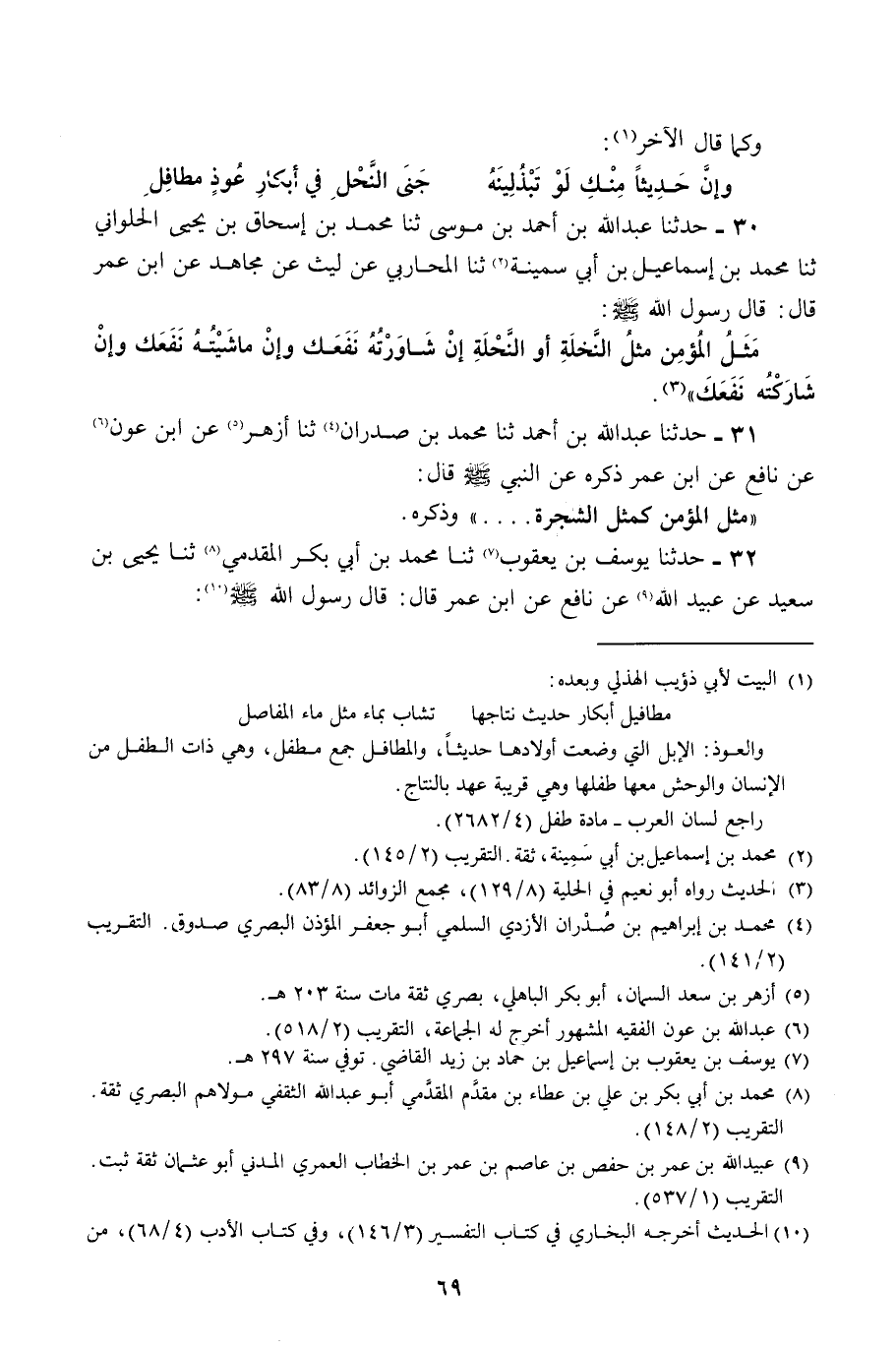 حَدَّثَنَا عَبْدُ اللَّهِ بْنُ أَحْمَدَ بْنِ مُوسَى، ثنا مُحَمَّدُ بْنُ إِسْحَاقَ بْنِ يَحْيَى الْحُلْوَانِيُّ، ثنا مُحَمَّدُ بْنُ إِسْمَاعِيلَ بْنِ أَبِي سَمِينَةَ، ثنا الْمُحَارِبِيُّ، عَنْ لَيْثٍ، عَنْ مُجَاهِدٍ، عَنِ ابْنِ عُمَرَ، قَالَ: قَالَ رَسُولُ اللَّهِ صَلَّى اللهُ عَلَيْهِ وَسَلَّمَ: «§مَثَلُ الْمُؤْمِنِ مَثَلُ النَّخْلَةِ، أَوِ النَّحْلَةِ إِنْ شَاوَرْتَهُ نَفَعَكَ، وَإِنْ مَاشَيْتَهُ نَفَعَكَ، وَإِنْ شَارَكْتَهُ نَفَعَكَ» حَدَّثَنَا عَبْدُ اللَّهِ بْنُ أَحْمَدَ بْنِ صُدْرَانَ، ثنا أَزْهَرُ، عَنِ ابْنِ عَوْنٍ، عَنْ نَافِعٍ، عَنِ ابْنِ عُمَرَ، ذَكَرَهُ عَنِ النَّبِيِّ صَلَّى اللهُ عَلَيْهِ وَسَلَّمَ قَالَ: «مَثَلُ الْمُؤْمِنِ كَمَثَلِ الشَّجَرَةِ» . . . . . وَذَكَرَهُ