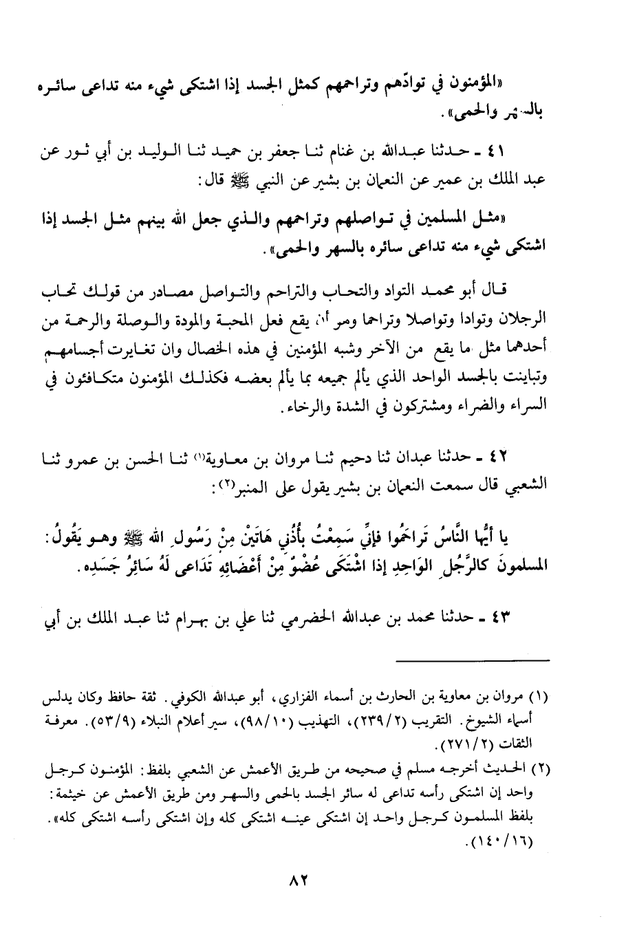 حَدَّثَنَا عَبْدُ اللَّهِ بْنُ غَنَّامٍ، ثنا جَعْفَرُ بْنُ حُمَيْدٍ، ثنا الْوَلِيدُ بْنُ أَبِي ثَوْرٍ، عَنْ عَبْدِ الْمَلِكِ بْنِ عُمَيْرٍ، عَنِ النُّعْمَانِ بْنِ بَشِيرٍ عَنِ النَّبِيِّ صَلَّى اللهُ عَلَيْهِ وَسَلَّمَ قَالَ: «§مَثْلُ الْمُسْلِمِينَ فِي تَوَاصُلِهِمْ، وَتَرَاحُمِهِمْ، وَالَّذِي جَعَلَ اللَّهُ بَيْنَهُمْ مَثْلُ الْجَسَدِ، إِذَا اشْتَكَى شَيْءٌ مِنْهُ تَدَاعَى سَائِرُهُ بِالسَّهَرِ وَالْحُمَّى» قَالَ أَبُو مُحَمَّدٍ: التَّوَادُّ، وَالتَّحَابُّ، وَالتَّرَاحُمُ، وَالتَّوَاصُلُ مَصَادِرُ، مِنْ قَوْلِكِ: تَحَابَّ الرَّجُلَانِ، وَتَوَادَّا، وَتَوَاصَلَا، وَتَرَاحَمَا، وَهُوَ أَنْ يَقَعَ فِعْلُ الْمَحَبَّةِ، وَالْمَوَدَّةِ، وَالْوَصْلَةِ، وَالرَّحْمَةِ مِنْ أَحَدِهِمَا مِثْلُ مَا يَقَعُ مِنَ الْآخَرِ وَشُبِّهَ الْمُؤْمِنُونَ فِي هَذِهِ الْخِصَالِ وَإِنْ تَغَايَرَتْ أَجْسَامُهُمْ وَتَبَايَنَتْ بِالْجَسَدِ الْوَاحِدِ الَّذِي يَأْلَمُ جَمِيعُهُ بِمَا يَأْلَمُ بَعْضُهُ، فَكَذَلِكَ الْمُؤْمِنُونَ مُتُكَافِئُونَ فِي السَّرَّاءِ، وُمُشْتَرِكُونَ فِي الشِّدَّةِ وَالرَّخَاءِ