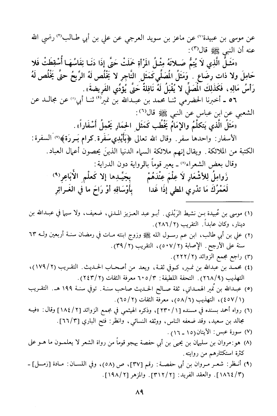 56 - أَخْبَرَنَا الْحَضْرَمِيُّ، ثنا مُحَمَّدُ بْنُ عَبْدِ اللَّهِ بْنِ نُمَيْرٍ، ثنا أَبِي، عَنْ مُجَالِدٍ، عَنِ الشَّعْبِيِّ، عَنِ ابْنِ عَبَّاسٍ، عَنِ النَّبِيِّ صَلَّى اللهُ عَلَيْهِ وَسَلَّمَ قَالَ: «§مَثَلُ الَّذِي يَتَكَلَّمُ وَالْإِمَامُ يَخْطُبُ كَمَثَلِ الْحِمَارِ يَحْمِلُ أَسْفَارًا» الْأَسْفَارُ: وَاحِدُهُمَا سِفْرٌ، وَقَالَ اللَّهُ تَعَالَى: {بِأَيْدِي سَفَرَةٍ كِرَامٍ بَرَرَةٍ} [عبس: 16] . السَّفَرَةُ: الْكَتَبَةُ مِنَ الْمَلَائِكَةِ، وَيُقَالُ إِنَّهُمْ مَلَائِكَةُ السَّمَاءِ الدُّنْيَا الَّذِينَ يُحْصُونَ أَعْمَالَ الْعِبَادِ وَقَالَ بَعْضُ الشُّعَرَاءِ - يُعَيِّرُ قَوْمًا بِالرِّوَايَةِ دُونَ الدِّرَايَةِ: