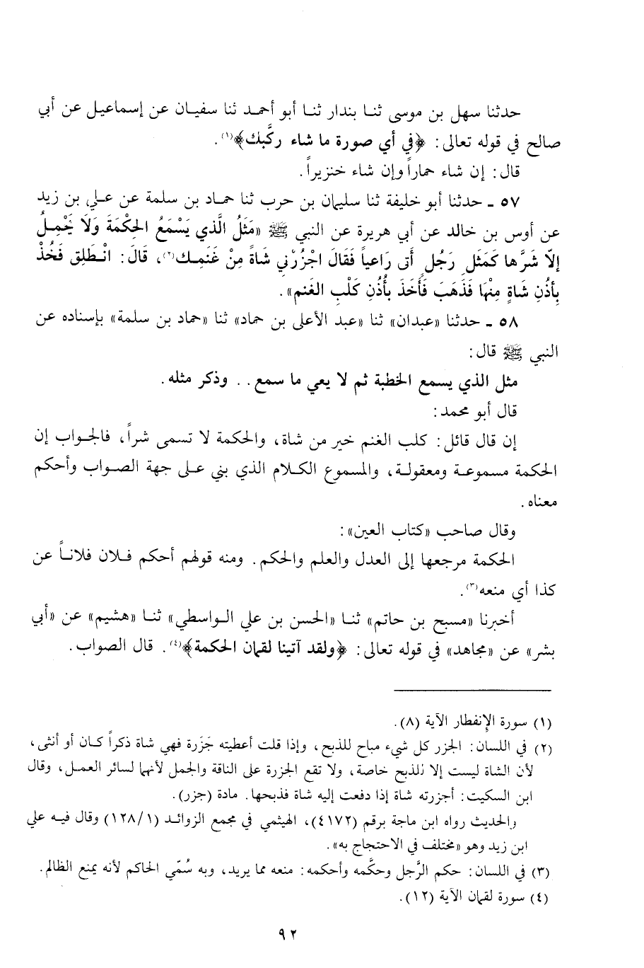58 - حَدَّثَنَا عَبْدَانُ، ثنا عَبْدُ الْأَعْلَى بْنُ حَمَّادٍ، ثنا حَمَّادُ بْنُ سَلَمَةَ، بِإِسْنَادِهِ عَنِ النَّبِيِّ صَلَّى اللهُ عَلَيْهِ وَسَلَّمَ قَالَ: «مَثَلُ الَّذِي يَسْمَعُ الْخُطْبَةَ ثُمَّ لَا يَعِي مَا يَسْمَعُ. . . . . . .» . وَذَكَرَ مِثْلَهُ قَالَ أَبُو مُحَمَّدٍ: إِنْ قَالَ قَائِلٌ: كَلْبُ الْغَنَمِ خَيْرٌ مِنْ شَاةٍ، وَالْحِكْمَةُ لَا تُسَمَّى شَرًّا، فَالْجَوَابُ أَنَّ الْحِكْمَةَ مَسْمُوعَةٌ وَمَعْقُولَةٌ، وَالْمَسْمُوعُ الْكَلَامُ الَّذِي بُنِيَ عَلَى جِهَةِ الصَّوَابِ وَأُحْكِمَ مَعْنَاهُ، وَقَالَ صَاحِبُ كِتَابِ الْعَيْنِ: الْحِكْمَةُ مَرْجِعُهَا إِلَى الْعَدْلِ وَالْعِلْمِ وَالْحُكْمِ، وَمِنْهُ قَوْلُهُمْ: أَحْكُمَ فُلَانٌ فُلَانًا عَنْ كَذَا، أَيْ مَنَعَهُ. أَخْبَرَنَا مُسَبِّحُ بْنُ حَاتِمٍ، ثنا الْحَسَنُ بْنُ عَلِيٍّ الْوَاسِطِيُّ، ثنا هُشَيْمٌ، عَنْ أَبِي بِشْرٍ، عَنْ مُجَاهِدٍ فِي قَوْلِهِ تَعَالَى: {وَلَقَدْ آتَيْنَا لُقْمَانَ الْحِكْمَةَ} [لقمان: 12] قَالَ: الصَّوَابُ -[93]- وَقَالَ جَرِيرٌ:
