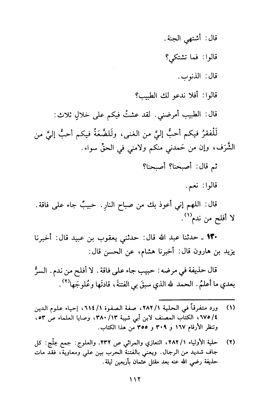 130 - حَدَّثَنَا عَبْدُ اللَّهِ قَالَ: حَدَّثَنِي يَعْقُوبُ بْنُ عُبَيْدٍ قَالَ: أَخْبَرَنَا يَزِيدُ بْنُ هَارُونَ قَالَ: أَخْبَرَنَا هِشَامٌ، عَنِ الْحَسَنِ قَالَ: قَالَ حُذَيْفَةُ فِي مَرَضِهِ: «§حَبِيبٌ جَاءَ عَلَى فَاقَةٍ. لَا أَفْلَحَ مَنْ نَدِمَ. السِّرُّ بَعْدِي مَا أَعْلَمُ. الْحَمْدُ لِلَّهِ الَّذِي سَبَقَ بِيَ الْفِتْنَةَ، قَادَتَهَا وَعُلُوجَهَا»