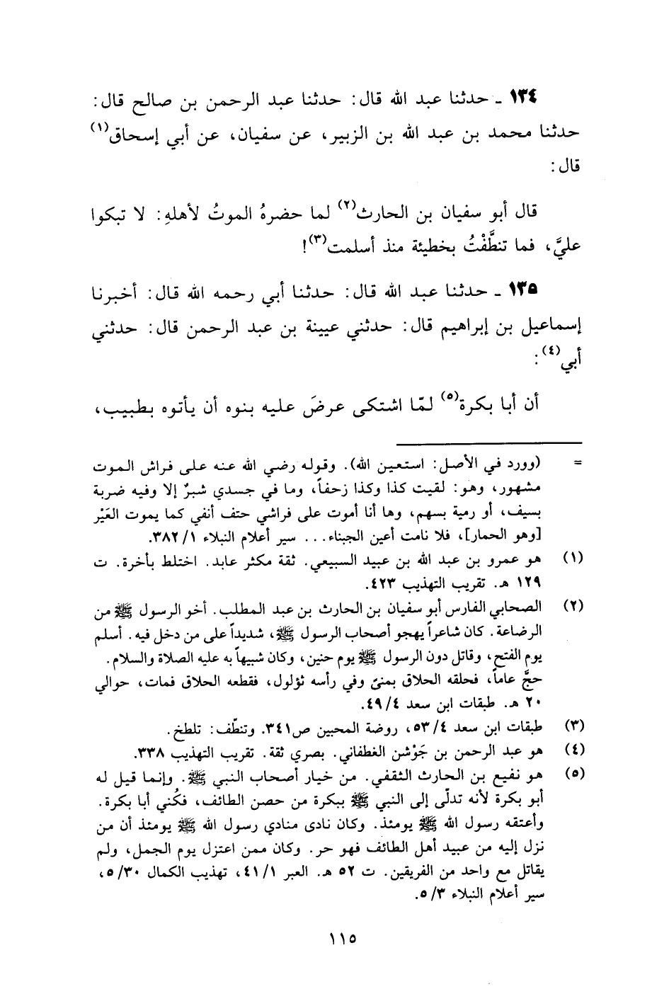 135 - حَدَّثَنَا عَبْدُ اللَّهِ قَالَ: حَدَّثَنَا أَبِي رَحِمَهُ اللَّهُ قَالَ: أَخْبَرَنَا إِسْمَاعِيلُ بْنُ إِبْرَاهِيمَ قَالَ: حَدَّثَنِي عُيَيْنَةُ بْنُ عَبْدِ الرَّحْمَنِ قَالَ: حَدَّثَنِي أَبِي: أَنَّ أَبَا بَكْرَةَ لَمَّا اشْتَكَى عَرَضَ عَلَيْهِ بَنُوهُ أَنْ يَأْتُوهُ بِطَبِيبٍ -[116]-، فَأَبَى. فَلَمَّا ثَقُلَ وَعَرَفَ الْمَوْتَ مِنْ نَفْسِهِ وَعَرَفُوهُ مِنْهُ قَالَ: " §أَيْنَ طَبِيبُكُمْ لِيَرُدَّهَا إِنْ كَانَ صَادِقًا؟ قَالُوا: وَمَا يُغْنِي الْآنَ؟ قَالَ: وَلَا قَبْلُ قَالَ: فَجَاءَتِ ابْنَتُهُ أَمَةُ اللَّهِ، فَلَمَّا رَأَتْ مَا بِهِ بَكَتْ، فَقَالَ: أَيْ بُنَيَّةُ، لَا تَبْكِي. قَالَتْ: يَا أَبَتَاهُ، فَإِنْ لَمْ أَبْكِ عَلَيْكَ فَعَلَى مَنْ أَبْكِي؟ قَالَ: لَا تَبْكِي، فَوَالَّذِي نَفْسِي بِيَدِهِ، مَا فِي الْأَرْضِ نَفْسٌ أَحَبُّ إِلَيَّ أَنْ تَكُونَ خَرَجَتْ مِنْ نَفْسِي هَذِهِ، وَلَا نَفْسُ هَذَا الذُّبَابِ الطَّائِرِ. ثُمَّ أَقْبَلَ عَلَى حُمْرَانَ - وَهُوَ عِنْدَ رَأْسِهِ - فَقَالَ: أَلَا أُخْبِرُكَ لِمَاذَا أُخْشِيتُهُ؟ وَاللَّهِ إِنْ أَمَرَ فَيَحُولُ بَيْنِي وَبَيْنَ الْإِسْلَامِ "