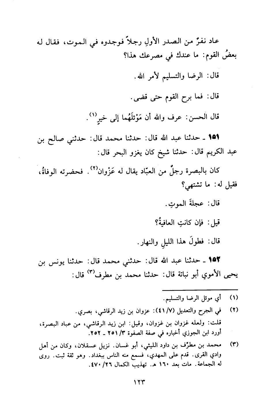 151 - حَدَّثَنَا عَبْدُ اللَّهِ قَالَ: حَدَّثَنَا مُحَمَّدٌ، قَالَ: حَدَّثَنِي صَالِحُ بْنُ عَبْدِ الْكَرِيمِ قَالَ: حَدَّثَنَا شَيْخٌ كَانَ يَغْزُو الْبَحْرَ قَالَ: كَانَ بِالْبَصْرَةِ رَجُلٌ مِنَ الْعُبَّادِ يُقَالُ لَهُ عَزْوَانُ. فَحَضَرَتْهُ الْوَفَاةُ، فَقِيلَ لَهُ: مَا تَشْتَهِي؟ قَالَ: " §عَجَلَةَ الْمَوْتِ. قِيلَ: فَإِنْ كَانَتِ الْعَافِيَةُ؟ قَالَ: فَطُولَ هَذَا اللَّيْلِ وَالنَّهَارِ "