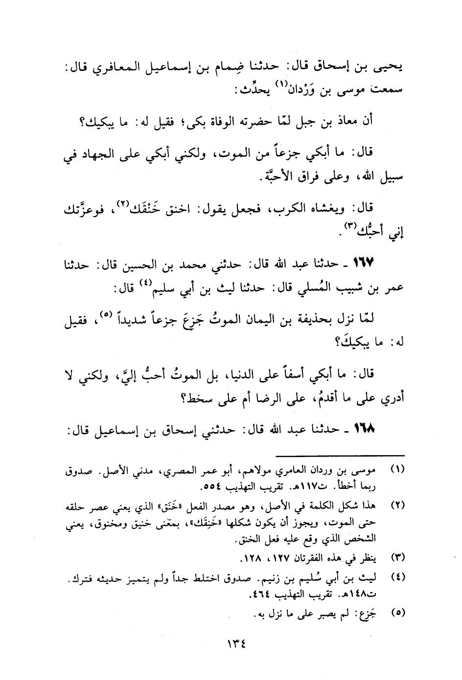 167 - حَدَّثَنَا عَبْدُ اللَّهِ قَالَ: حَدَّثَنِي مُحَمَّدُ بْنُ الْحُسَيْنِ قَالَ: حَدَّثَنَا عُمَرُ بْنُ شَبِيبٍ الْمُسْلِيُّ قَالَ: حَدَّثَنَا لَيْثُ بْنُ أَبِي سُلَيْمٍ قَالَ: لَمَّا نَزَلَ بِحُذَيْفَةَ بْنِ الْيَمَانِ الْمَوْتُ جَزِعَ جَزَعًا شَدِيدًا، فَقِيلَ لَهُ: مَا يُبْكِيكَ؟ قَالَ: «§مَا أَبْكِي أَسَفًا عَلَى الدُّنْيَا، بَلِ الْمَوْتُ أَحَبُّ إِلَيَّ، وَلَكِنِّي لَا أَدْرِي عَلَى مَا أُقْدِمُ، عَلَى الرِّضَا أَمْ عَلَى سَخَطٍ؟»