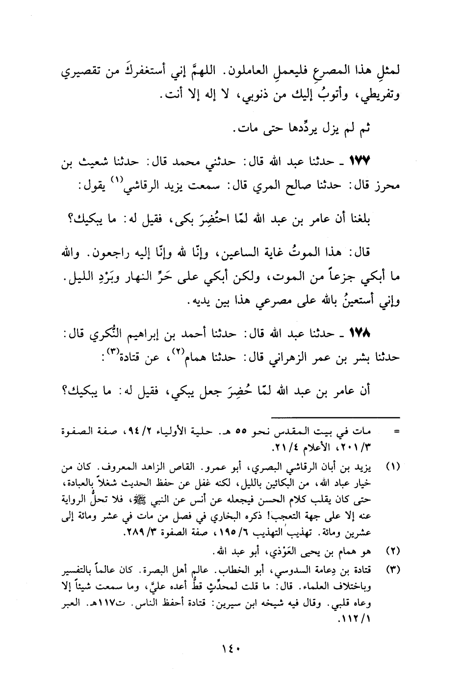 177 - حَدَّثَنَا عَبْدُ اللَّهِ قَالَ: حَدَّثَنِي مُحَمَّدٌ قَالَ: حَدَّثَنَا شُعَيْبُ بْنُ مُحْرِزٍ قَالَ: حَدَّثَنَا صَالِحٌ الْمُرِّيُّ قَالَ: سَمِعْتُ يَزِيدَ الرَّقَاشِيَّ يَقُولُ: بَلَغَنَا أَنَّ عَامِرَ بْنَ عَبْدِ اللَّهِ لَمَّا احْتُضِرَ بَكَى، فَقِيلَ لَهُ: مَا يُبْكِيكَ؟ قَالَ: «§هَذَا الْمَوْتُ غَايَةُ السَّاعِينَ، وَإِنَّا لِلَّهِ وَإِنَّا إِلَيْهِ رَاجِعُونَ. وَاللَّهِ مَا أَبْكِي جَزَعًا مِنَ الْمَوْتِ، وَلَكِنْ أَبْكِي عَلَى حَرِّ النَّهَارِ وَبَرْدِ اللَّيْلِ. وَإِنِّي أَسْتَعِينُ بِاللَّهِ عَلَى مَصْرَعِي هَذَا بَيْنَ يَدَيْهِ»