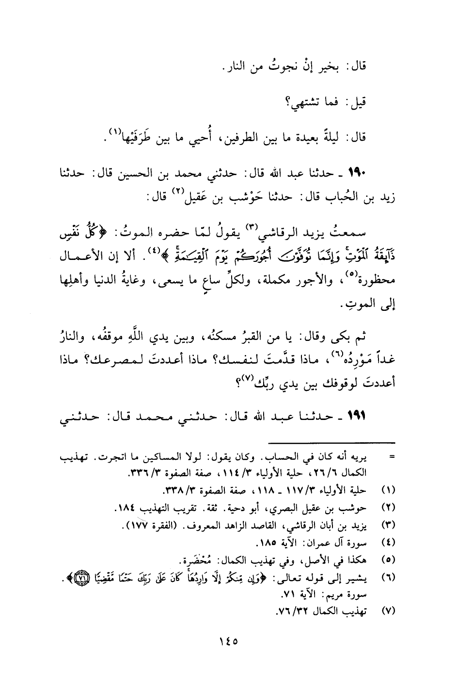 190 - حَدَّثَنَا عَبْدُ اللَّهِ قَالَ: حَدَّثَنِي مُحَمَّدُ بْنُ الْحُسَيْنِ قَالَ: حَدَّثَنَا زَيْدُ بْنُ الْحُبَابِ قَالَ: حَدَّثَنَا حَوْشَبُ بْنُ عَقِيلٍ قَالَ: سَمِعْتُ يَزِيدَ الرَّقَاشِيَّ يَقُولُ لَمَّا حَضَرَهُ الْمَوْتُ: {§كُلُّ نَفْسٍ ذَائِقَةُ الْمَوْتِ وَإِنَّمَا تُوَفَّوْنَ أُجُورَكُمْ يَوْمَ الْقِيَامَةِ} [آل عمران: 185] . أَلَا إِنَّ الْأَعْمَالَ مُحْضَرَةٌ، وَالْأُجُورَ مُكْمَلَةٌ، وَلِكُلِّ سَاعٍ مَا يَسْعَى، وَغَايَةُ الدُّنْيَا وَأَهْلُهَا إِلَى الْمَوْتِ. ثُمَّ بَكَى وَقَالَ: يَا مَنِ الْقَبْرُ مَسْكَنُهُ، وَبَيْنَ يَدَيِ اللَّهِ مَوْقِفُهُ، وَالنَّارُ غَدًا مَوْرِدُهُ، مَاذَا قَدَّمْتَ لِنَفْسِكَ؟ مَاذَا أَعْدَدْتَ لِمَصْرَعِكَ؟ مَاذَا أَعْدَدْتَ لِوُقُوفِكَ بَيْنَ يَدَيْ رَبِّكَ؟ "