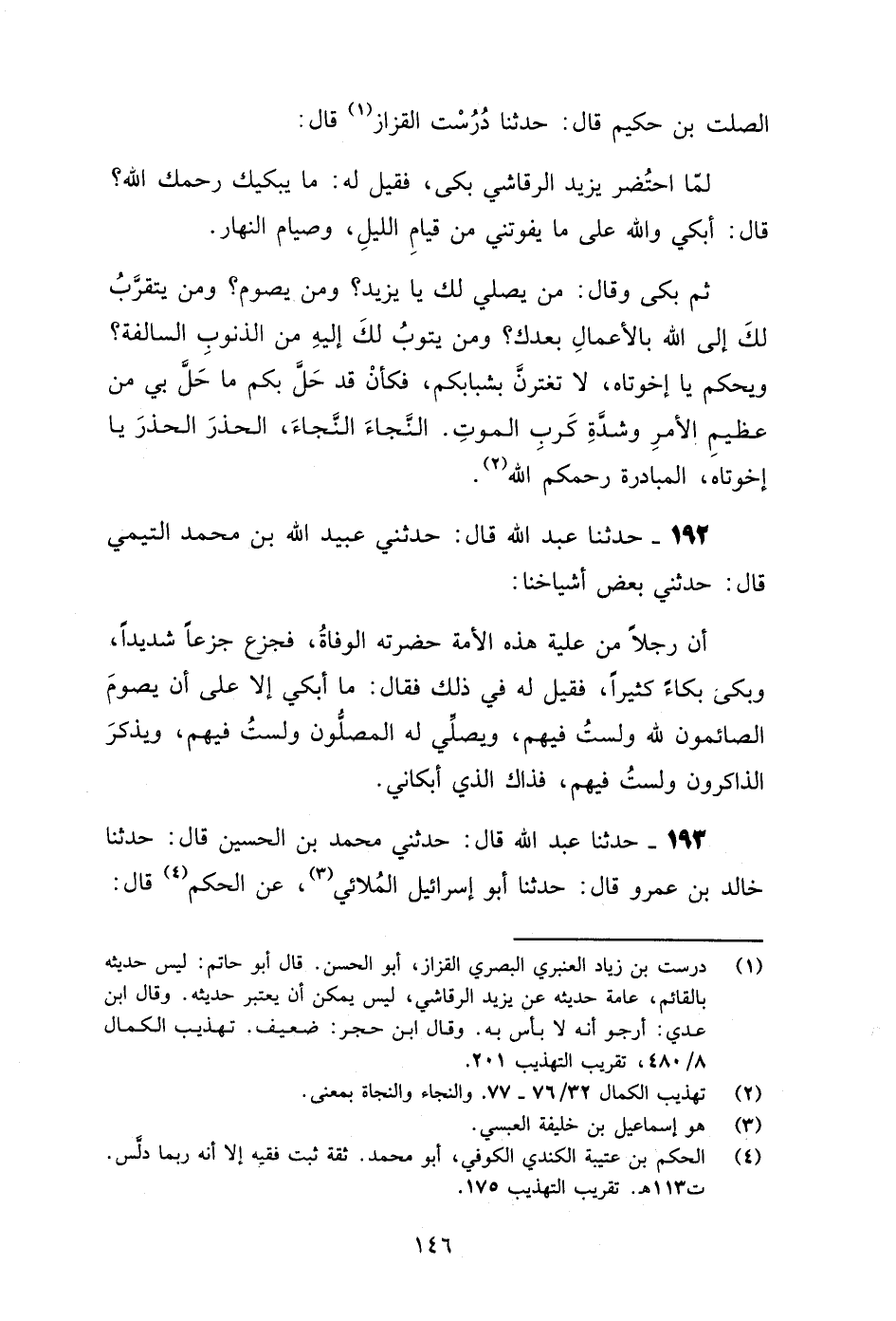 193 - حَدَّثَنَا عَبْدُ اللَّهِ قَالَ: حَدَّثَنِي مُحَمَّدُ بْنُ الْحُسَيْنِ قَالَ: حَدَّثَنَا خَالِدُ بْنُ عَمْرٍو قَالَ: حَدَّثَنَا أَبُو إِسْرَائِيلَ الْمُلَائِيُّ، عَنِ الْحَكَمِ قَالَ -[147]-: لَمَّا احْتُضِرَ عَبْدُ الرَّحْمَنِ بْنُ الْأَسْوَدِ بَكَى، فَقِيلَ لَهُ: مَا يُبْكِيكَ؟ قَالَ: " §أَسَفًا عَلَى الصَّوْمِ وَالصَّلَاةِ. قَالَ: وَلَمْ يَزَلْ يَقْرَأُ الْقُرْآنَ حَتَّى مَاتَ. قَالَ: فَرُئِيَ لَهُ أَنَّهُ مِنْ أَهْلِ الْجَنَّةِ. قَالَ: وَكَانَ الْحَكَمُ يَقُولُ: وَلَا يَبْعُدُ مِنْ ذَاكَ، لَقَدْ كَانَ يُعْمِلُ نَفْسَهُ مُجْتَهِدًا لِهَذَا، حَذِرًا مِنْ مَصْرَعِهِ الَّذِي صَارَ إِلَيْهِ "